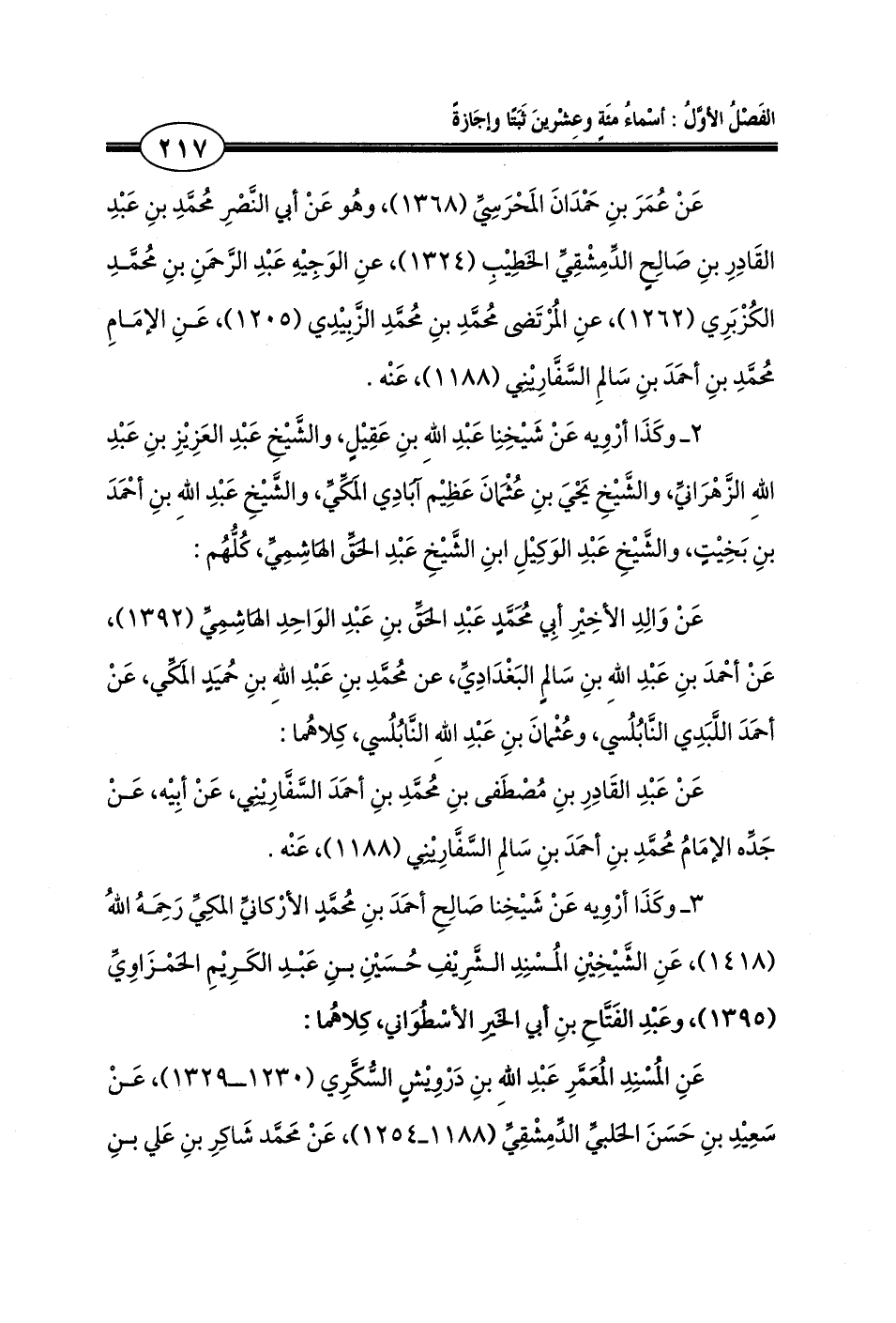 عَنْ عَبْدِ القَادِرِ بنِ مُصْطَفى بنِ مُحمَّدِ بنِ أحمَدَ السَّفَّارِيْنِي، عَنْ أبِيْه، عَنْ جَدِّه الإمَامُ مُحمَّدِ بنِ أحمَدَ بنِ سَالمِ السَّفَّارِيْنِي (1188)، عَنْه.