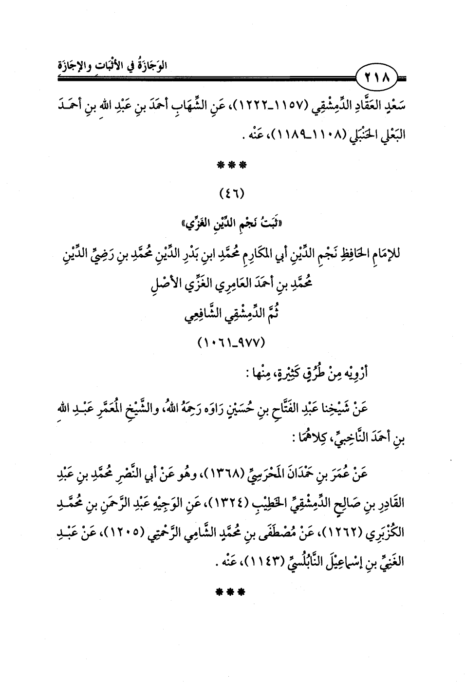 للإمَامِ الحَافِظِ نَجْمِ الدِّيْنِ أبي المكَارِمِ مُحمَّدِ ابنِ بَدْرِ الدِّيْنِ مُحمَّدِ بنِ رَضِيِّ الدِّيْنِ مُحمَّدِ بنِ أحمَدَ العَامِرِي الغَزِّي الأصْلِ، ثُمَّ الدِّمِشْقِي الشَّافِعِي (977 ـ 1061)