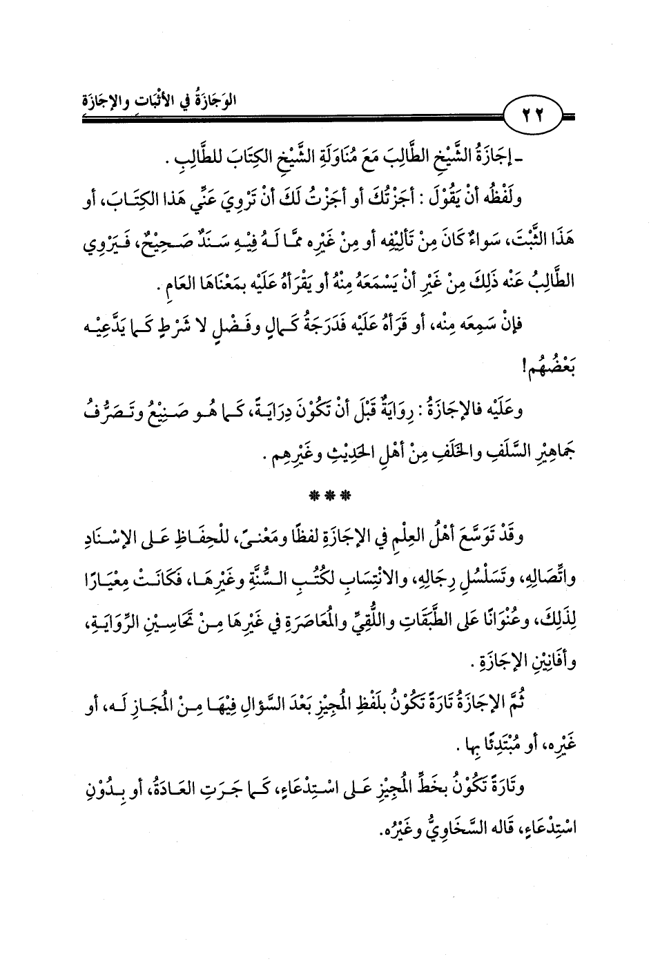 وقَدْ تَوَسَّعَ أهْلُ العِلْمِ في الإجَازَةِ لفظًا ومَعْنىً، للْحِفَاظِ عَلى الإسْنَادِ واتِّصَالِهِ، وتَسَلْسُلِ رِجَالِهِ، والانْتِسَابِ لكُتُبِ السُّنَّةِ وغَيْرِهَا، فَكَانَتْ مِعْيَارًا لِذَلِكَ، وعُنْوَانًا عَلى الطَّبَقَاتِ واللُّقِيِّ والمُعَاصَرَةِ في غَيْرِهَا مِنْ تَحَاسِيْنِ الرِّوَايَةِ، وأفَانِيْنِ الإجَازَةِ.