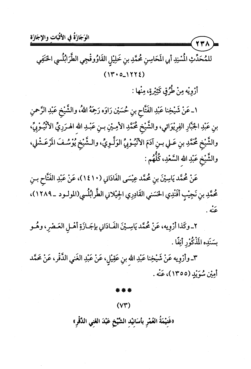 عَنْ مُحمَّد يَاسِيْنَ بنِ مُحمَّد عِيْسَى الفَادَاني (1410)، عَنْ عَبْدِ الفَتَّاحِ بنِ مُحمَّدِ بنِ نَجِيْبٍ أفَنْدِي الحَسَني القَادِرِي الجِيْلاني الطَّرابُلُسي (المولود ـ 1289)، عَنْه.