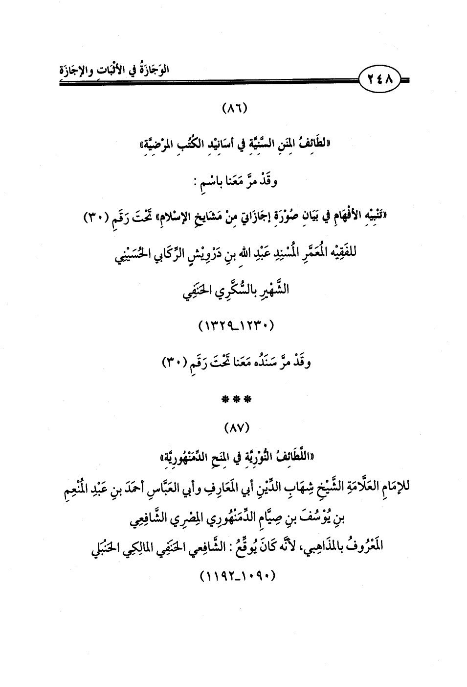وقَدْ مرَّ مَعَنا باسْمِ: «تَنْبِيْهِ الأفْهَامِ في بَيَانِ صُوْرَةِ إجَازَاتي مِنْ مَشَايخِ الإسْلامِ»، تَحْتَ رَقَمِ (30)