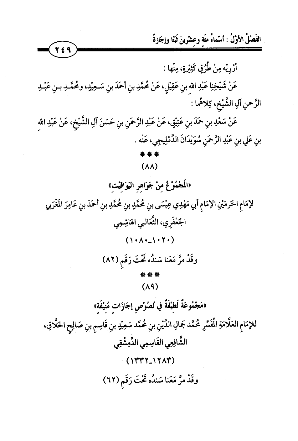 أرْوِيه عَنْ شَيْخِنِا عَبْدِ اللهِ بنِ عَقِيْلٍ، عَنْ مُحمَّدِ بنِ أحمَدَ بنِ سَعِيْدٍ، ومُحمَّدِ بنِ عَبْدِ الرَّحمنِ آلِ الشَّيْخِ، كِلاهُما: