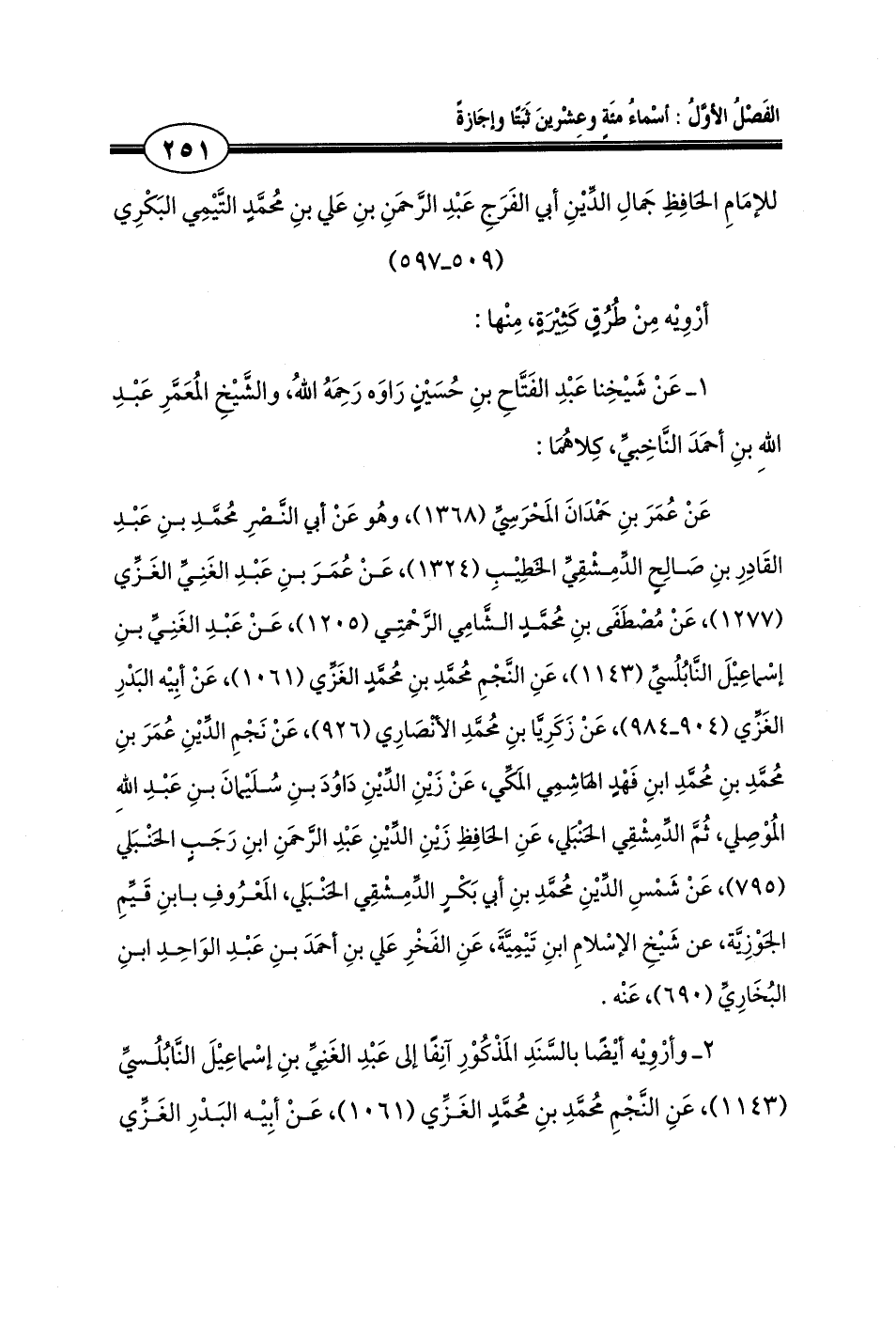 عَنْ عُمَرَ بنِ حَمْدَانَ المَحْرَسِيِّ (1368)، وهُو عَنْ أبي النَّصْرِ مُحمَّدِ بنِ عَبْدِ القَادِرِ بنِ صَالِحٍ الدِّمِشْقِيِّ الخَطِيْبِ (1324)، عَنْ عُمَرَ بنِ عَبْدِ الغَنِيِّ الغَزِّي (1277)، عَنْ مُصْطَفَى بنِ مُحمَّدٍ الشَّامِي الرَّحْمتِي (1205)، عَنْ عَبْدِ الغَنِيِّ بنِ إسْماعِيْلَ النَّابُلُسيِّ (1143)، عَنِ النَّجْمِ مُحمَّدِ بنِ مُحمَّدٍ الغَزِّي (1061)، عَنْ أبِيْه البَدْرِ الغَزِّي