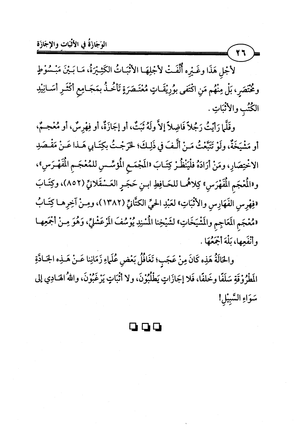 والحَالَةُ هَذِه كَانَ مِنْ عَجَبٍ؛ تَغَافُلُ بَعْضِ عُلَماءِ زَمَانِنا عَنْ هَذِه الجَادَّةِ المَطْرُوْقَةِ سَلَفًا وخَلفًا، فَلا إجَازَاتٍ يَطْلُبُوْنَ، ولا أثْبَاتٍ يَرْغَبُوْنَ، واللهُ الهَادِي إلى سَوَاءِ السَّبِيْلِ!