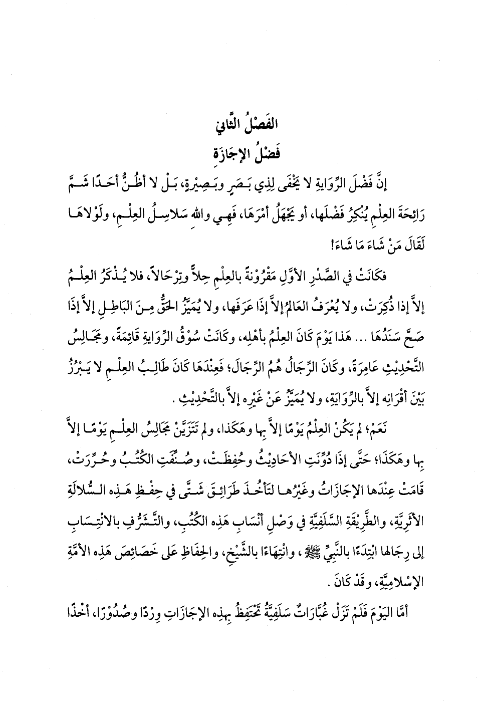 نَعَمْ؛ لم يَكُنْ العِلْمُ يَوْمًا إلاَّ بِها وهَكَذا، ولم تَتَزَيَّنْ مَجَالِسُ العِلْمِ يَوْمًا إلاَّ بِها وهَكَذَا؛ حَتَّى إذَا دُوِّنَتِ الأحَادِيْثُ وحُفِظَتْ، وصُنِّفَتِ الكُتُبُ وحُرِّرَتْ، قَامَتْ عِنْدَها الإجَازَاتُ وغَيْرُها لتَأخُذَ طَرَائِقَ شَتَّى في حِفْظِ هَذِه السُّلالَةِ الأثَرِيَّةِ، والطَّرِيْقَةِ السَّلَفِيَّةِ في وَصْلِ أنْسَابِ هَذِه الكُتُبِ، والتَّشَرُّفِ بالانْتِسَابِ إلى رِجَالها ابْتِدَءًا بالنَّبِيِّ - صلى الله عليه وسلم -، وانْتِهَاءًا بالشَّيْخِ، والحِفَاظِ عَلى خَصَائِصَ هَذِه الأمَّةِ الإسْلامِيَّةِ، وقَدْ كَانَ.
