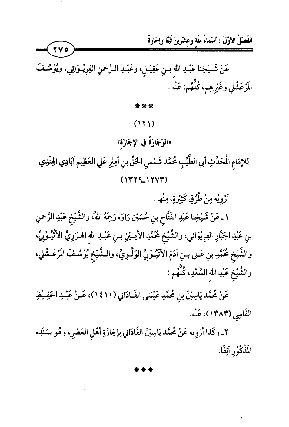 2 ـ وكَذا أرْوِيه عَنْ مُحمَّد يَاسِيْنَ الفَادَاني بإجَازَةِ أهْلِ العَصْرِ، وهُو بسَنَدِه المَذْكُوْرِ آنِفًا.