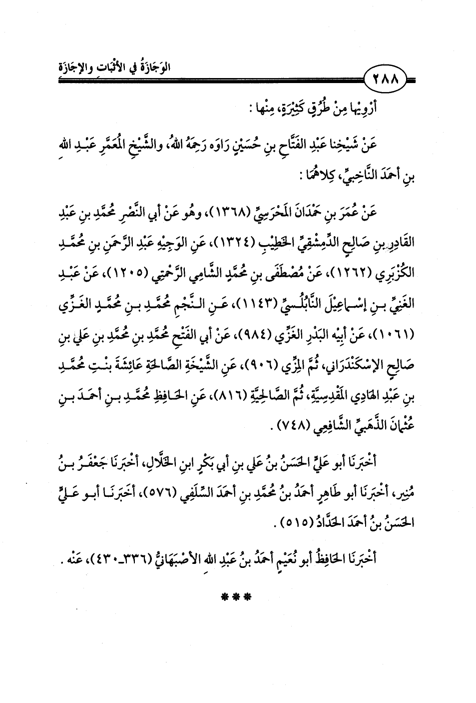 عَنْ عُمَرَ بنِ حَمْدَانَ المَحْرَسِيِّ (1368)، وهُو عَنْ أبي النَّصْرِ مُحمَّدِ بنِ عَبْدِ القَادِرِ بنِ صَالِحٍ الدِّمِشْقِيِّ الخَطِيْبِ (1324)، عَنِ الوَجِيْهِ عَبْدِ الرَّحمَنِ بنِ مُحمَّدِ الكُزْبَرِي (1262)، عَنْ مُصْطَفَى بنِ مُحمَّدٍ الشَّامِي الرَّحْمتِي (1205)، عَنْ عَبْدِ الغَنِيِّ بنِ إسْماعِيْلَ النَّابُلُسيِّ (1143)، عَنِ النَّجْمِ مُحمَّدِ بنِ مُحمَّدٍ الغَزِّي (1061)، عَنْ أبِيْه البَدْرِ الغَزِّي (984)، عَنْ أبي الفَتْحِ مُحمَّدِ بنِ مُحمَّدِ بنِ عَلي بنِ صَالِحٍ الإسْكَنْدَرَاني، ثُمَّ المِزِّي (906)، عَنِ الشَّيْخَةِ الصَّالحَةِ عَائِشَةَ بنْتِ مُحمَّدِ بنِ عَبْدِ الهَادِي المَقْدِسِيَّةِ، ثُمَّ الصَّالحِيَّةِ (816)، عَنِ الحَافِظِ مُحمَّدِ بنِ أحمَدَ بنِ عُثْمانَ الذَّهَبيِّ الشَّافِعِي (748)، أخْبَرنَا أبو عَليٍّ الحَسَنُ بنُ عَلي بنِ أبي بَكْرٍ ابنِ الخَلَّالِ، أخْبَرنَا جَعْفَرُ بنُ مُنِير، أخْبَرنَا أبو طَاهِرٍ أحمَدُ بنُ مُحمَّدِ بنِ أحمَدَ السِّلَفِي (576)، أخَبَرنَا أبو عَليٍّ الحَسَنُ بنُ أحمَدَ الحَدَّادُ (515)، أخْبَرنَا الحَافِظُ أبو نُعَيْمٍ أحمَدُ بنُ عَبْدِ اللهِ الأصْبَهَانيُّ (336 ـ 430)، عَنْه.