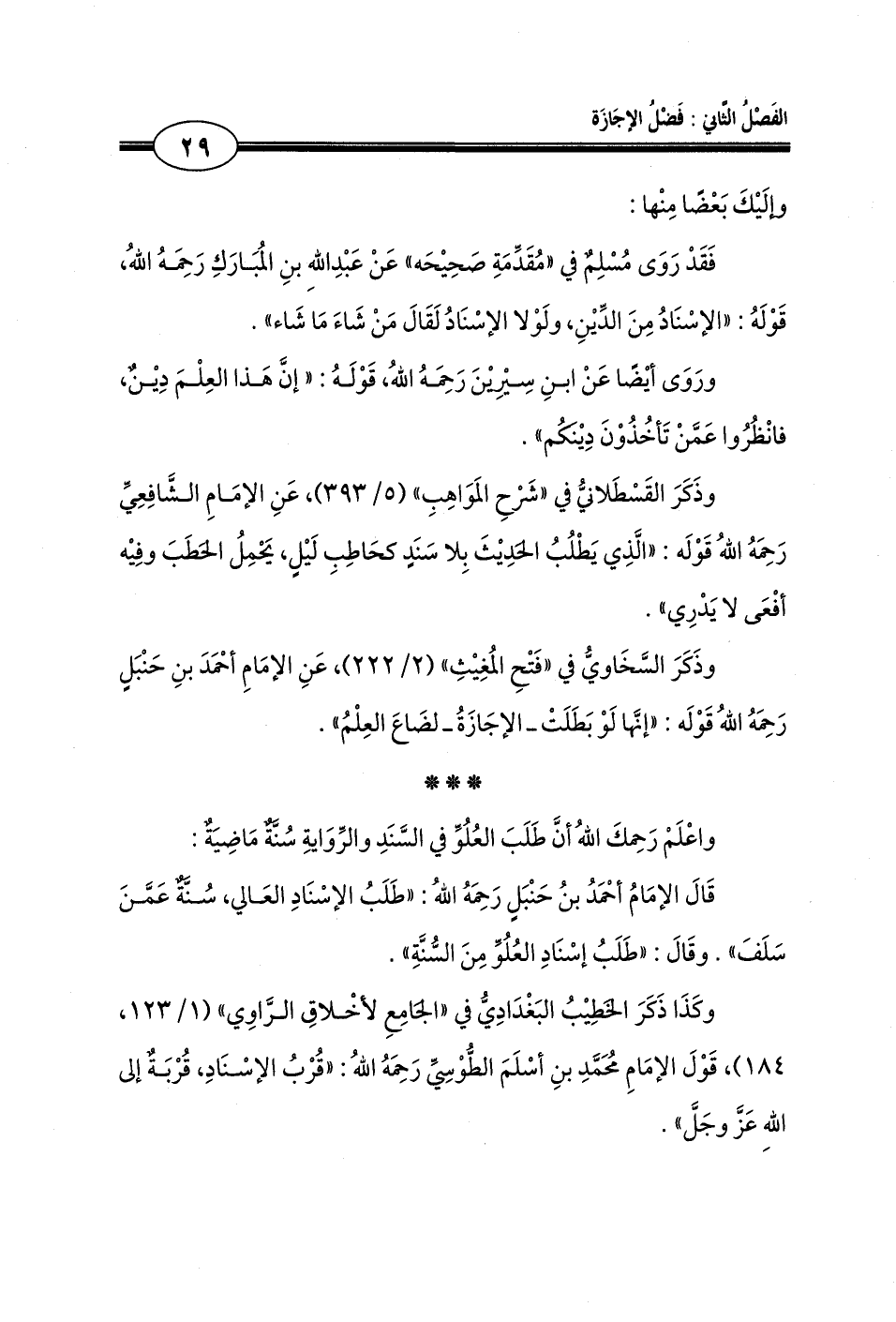 قَالَ الإمَامُ أحْمَدُ بنُ حَنْبَلٍ رَحِمَهُ اللهُ: «طَلَبُ الإسْنَادِ العَالي، سُنَّةٌ عَمَّنَ سَلَفَ».