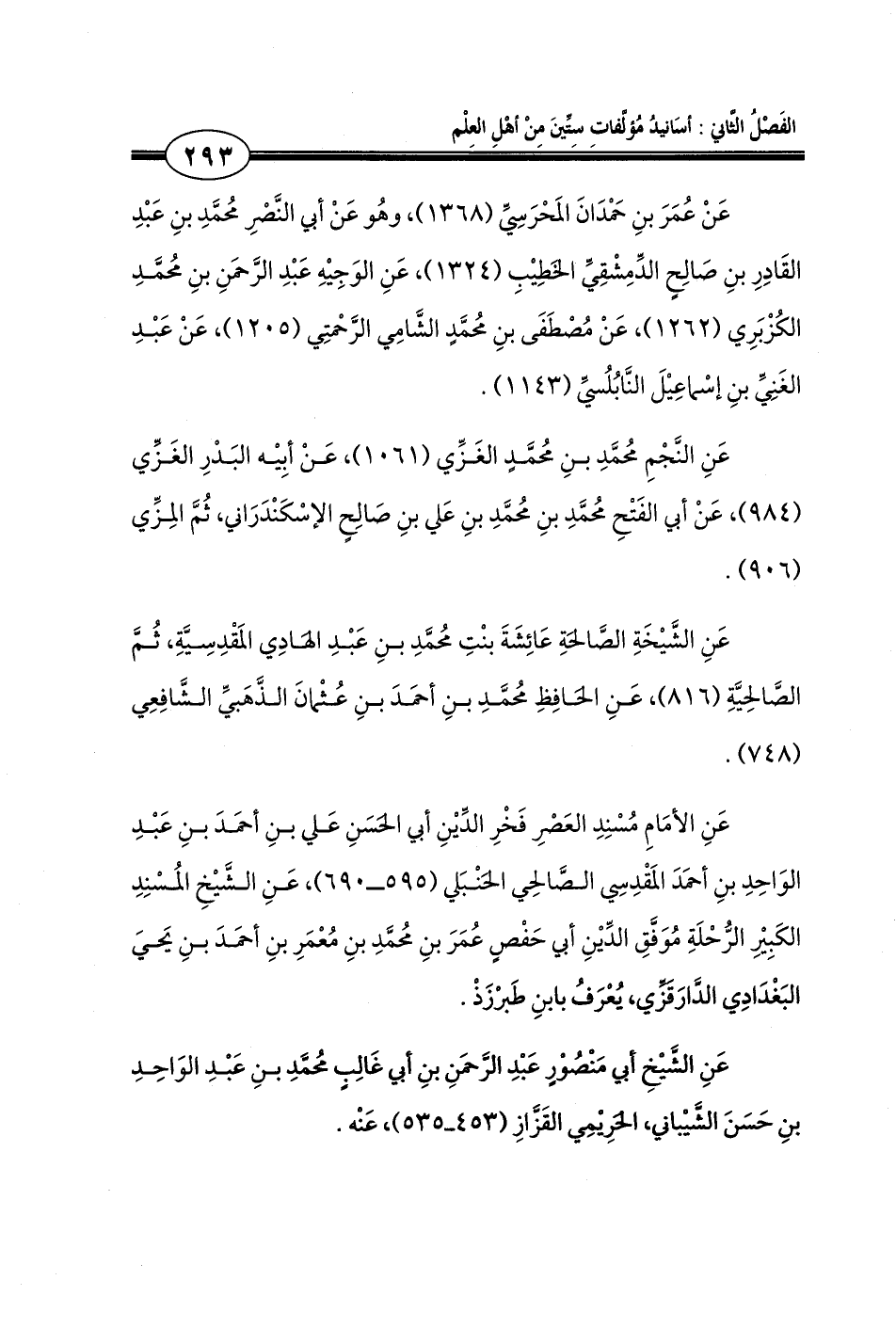 عَنْ عُمَرَ بنِ حَمْدَانَ المَحْرَسِيِّ (1368)، وهُو عَنْ أبي النَّصْرِ مُحمَّدِ بنِ عَبْدِ القَادِرِ بنِ صَالِحٍ الدِّمِشْقِيِّ الخَطِيْبِ (1324)، عَنِ الوَجِيْهِ عَبْدِ الرَّحمَنِ بنِ مُحمَّدِ الكُزْبَرِي (1262)، عَنْ مُصْطَفَى بنِ مُحمَّدٍ الشَّامِي الرَّحْمتِي (1205)، عَنْ عَبْدِ الغَنِيِّ بنِ إسْماعِيْلَ النَّابُلُسيِّ (1143)، عَنِ النَّجْمِ مُحمَّدِ بنِ مُحمَّدٍ الغَزِّي (1061)، عَنْ أبِيْه البَدْرِ الغَزِّي (984)، عَنْ أبي الفَتْحِ مُحمَّدِ بنِ مُحمَّدِ بنِ عَلي بنِ صَالِحٍ الإسْكَنْدَرَاني، ثُمَّ المِزِّي (906)، عَنِ الشَّيْخَةِ الصَّالحَةِ عَائِشَةَ بنْتِ مُحمَّدِ بنِ عَبْدِ الهَادِي المَقْدِسِيَّةِ، ثُمَّ الصَّالحِيَّةِ (816)، عَنِ الحَافِظِ مُحمَّدِ بنِ أحمَدَ بنِ عُثْمانَ الذَّهَبيِّ الشَّافِعِي (748)، عَنِ الأمَامِ مُسْنِدِ العَصْرِ فَخْرِ الدِّيْنِ أبي الحَسَنِ عَلي بنِ أحمَدَ بنِ عَبْدِ الوَاحِدِ بنِ أحمَدَ المَقْدِسِي الصَّالحِي الحَنْبَلي (595 ـ 690)، عَنِ الشَّيْخِ المُسْنِدِ الكَبِيْرِ الرُّحْلَةِ مُوَفَّقِ الدِّيْنِ أبي حَفْصٍ عُمَرَ بنِ مُحمَّدِ بنِ مُعْمَرِ بنِ أحمَدَ بنِ يَحيَ البَغْدَادِي الدَّارَقَزِّي، يُعْرَفُ بابنِ طَبرْزَذْ، عَنِ الشَّيْخِ أبي مَنْصُوْرٍ عَبْدِ الرَّحمَنِ بنِ أبي غَالِبٍ مُحمَّدِ بنِ عَبْدِ الوَاحِدِ بنِ حَسَنَ الشَّيْباني، الحَرِيْمِي القَزَّازِ (453 ـ 535)، عَنْه.