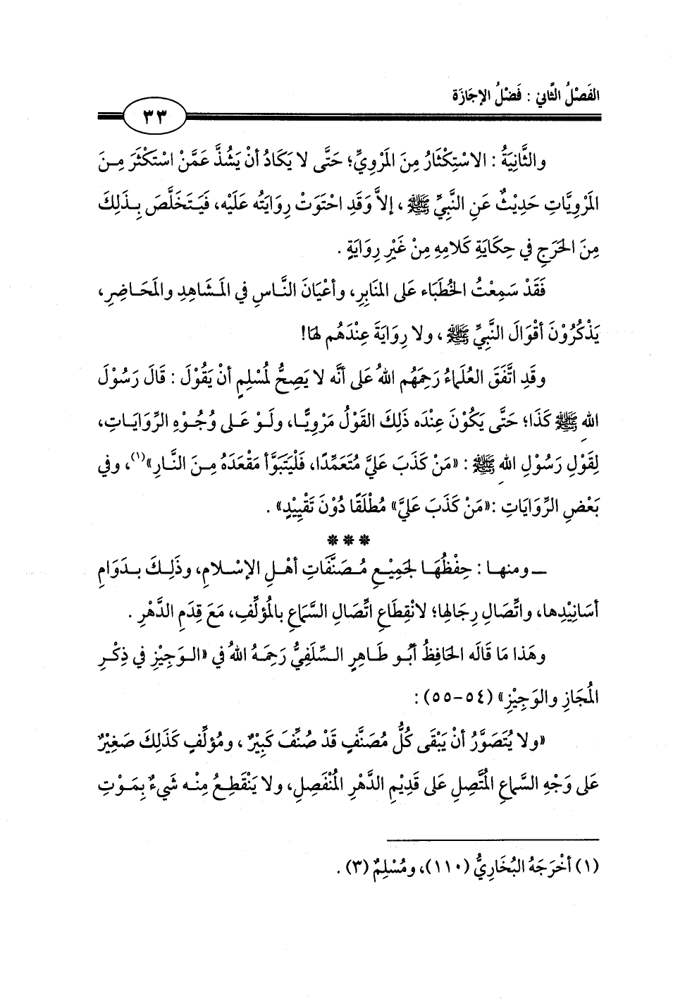 وهَذا مَا قَالَه الحَافِظُ أبُو طَاهِرٍ السِّلَفِيُّ رَحِمَهُ اللهُ في «الوَجِيْزِ في ذِكْرِ المُجَازِ والوَجِيْزِ» (54 - 55): «ولا يُتَصَوَّرُ أنْ يَبْقَى كُلُّ مُصَنَّفٍ قَدْ صُنِّفَ كَبِيْرٌ، ومُؤلِّفٍ كَذَلِكَ صَغِيْرٌ عَلى وَجْهِ السَّماعِ المُتَّصِلِ عَلى قَدِيْمِ الدَّهْرِ المُنْفَصِلِ، ولا يَنْقَطِعُ مِنْه شَيءٌ بِمَوْتِ