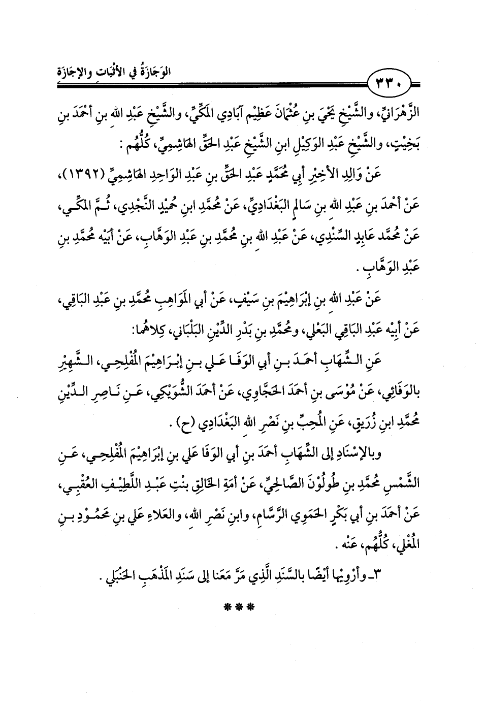 عَنْ وَالِدِ الأخِيْرِ أبِي مُحَمَّدٍ عَبْدِ الحَقِّ بنِ عَبْدِ الوَاحِدِ الهَاشِمِيِّ (1392)، عَنْ أحْمدَ بنِ عَبْدِ اللهِ بنِ سَالمٍ البَغْدَادِيِّ، عَنْ مُحمَّدِ ابنِ حُميْدٍ النَّجْدِي، ثُمَّ المكِّي، عَنْ مُحمَّد عَابِدٍ السِّنْدِي، عَنْ عَبْدِ اللهِ بنِ مُحمَّدِ بنِ عَبْدِ الوَهَّابِ، عَنْ أبَيْه مُحمَّدِ بنِ عَبْدِ الوَهَّابِ، عَنْ عَبْدِ اللهِ بنِ إبْرَاهِيْمَ بنِ سَيْفٍ، عَنْ أبي المَوَاهِبِ مُحمَّدِ بنِ عَبْدِ البَاقِي، عَنْ أبِيْه عَبْدِ البَاقِي البَعْلي، ومُحمَّدِ بنِ بَدْرِ الدِّيْنِ البَلْبَاني، كِلاهُما: