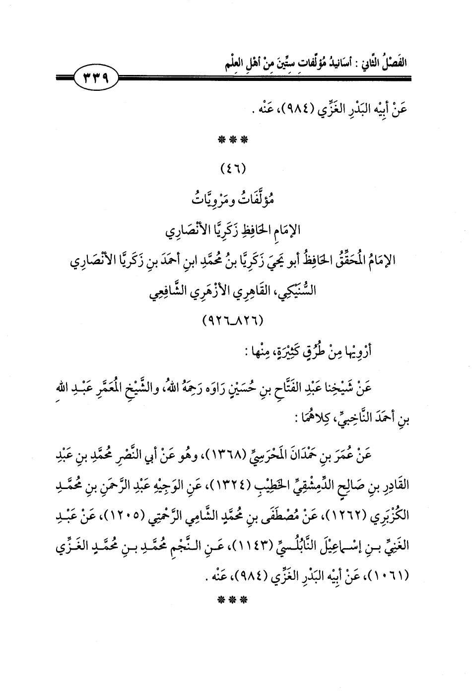 مُؤلَّفَاتُ ومَرْوِيَّاتُ الإمَامِ الحَافِظِ زَكَرِيَّا الأنْصَارِي الإمَامُ المُحَقِّقُ الحَافِظُ أبو يَحيَ زَكَرِيَّا بنُ مُحمَّدِ ابنِ أحمَدَ بنِ زَكَريَّا الأنْصَارِي السُّنَيْكِي، القَاهِرِي الأزْهَرِي الشَّافِعِي (826 ـ 926)