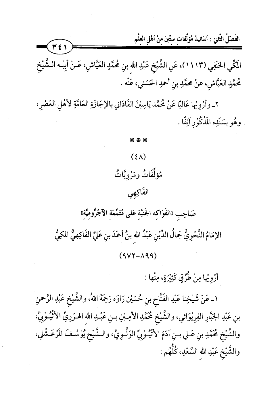 مُؤلَّفَاتُ ومَرْوِيَّاتُ الفَاكِهِي صَاحِبِ «الفَوَاكِه الجَنيَّةِ عَلى مُتَمِّمَةِ الآجُرُّومِيَّةِ» الإمَامُ النَّحْوِيُّ جَمالُ الدِّيْنِ عَبْدُ اللهِ بنُ أحمَدَ بنِ عَليِّ الفَاكِهيُّ المكِيُّ (899 - 972)