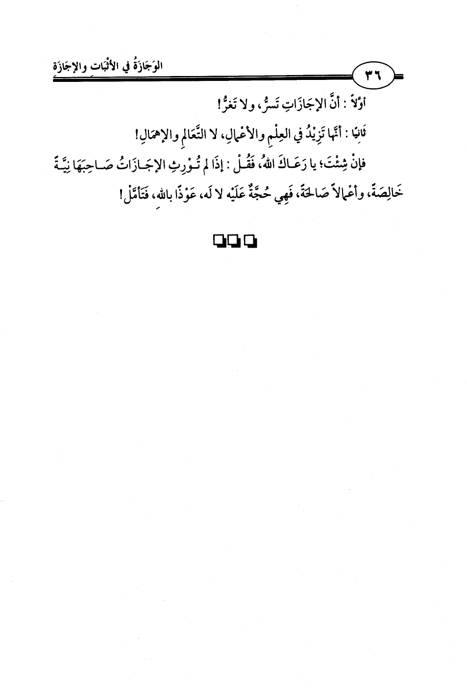 فإنْ شِئْتَ؛ يا رَعَاكَ اللهُ، فَقُلْ: إذَا لم تُوْرِثِ الإجَازَاتُ صَاحِبَهَا نِيَّةً خَالِصَةً، وأعْمالاً صَالحَةً، فَهِي حُجَّةٌ عَلَيْه لا لَه، عَوْذًا باللهِ، فَتَأمَّلْ!
