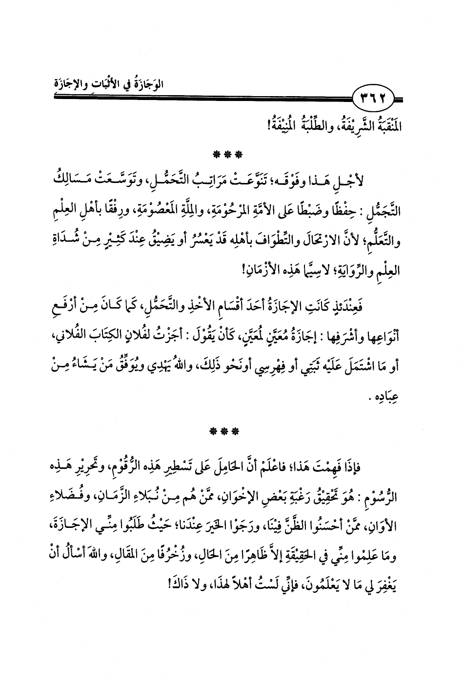فَعِنْدَئذٍ كَانَتِ الإجَازَةُ أحَدَ أقْسَامِ الأخْذِ والتَّحَمُّلِ، كَما كَانَ مِنْ أرْفَعِ أنْوَاعِها وأشْرَفِها: إجَازَةُ مُعَيَّنٍ لمُعَيَّنٍ، كَأنْ يَقُوْلَ: أجَزْتُ لفُلانٍ الكِتَابَ الفُلاني، أو مَا اشْتَمَلَ عَلَيْه ثَبَتِي أو فِهْرِسِي أونَحْو ذَلِكَ، واللهُ يَهْدِي ويُوَفِّقُ مَنْ يَشَاءُ مِنْ عِبَادِه.