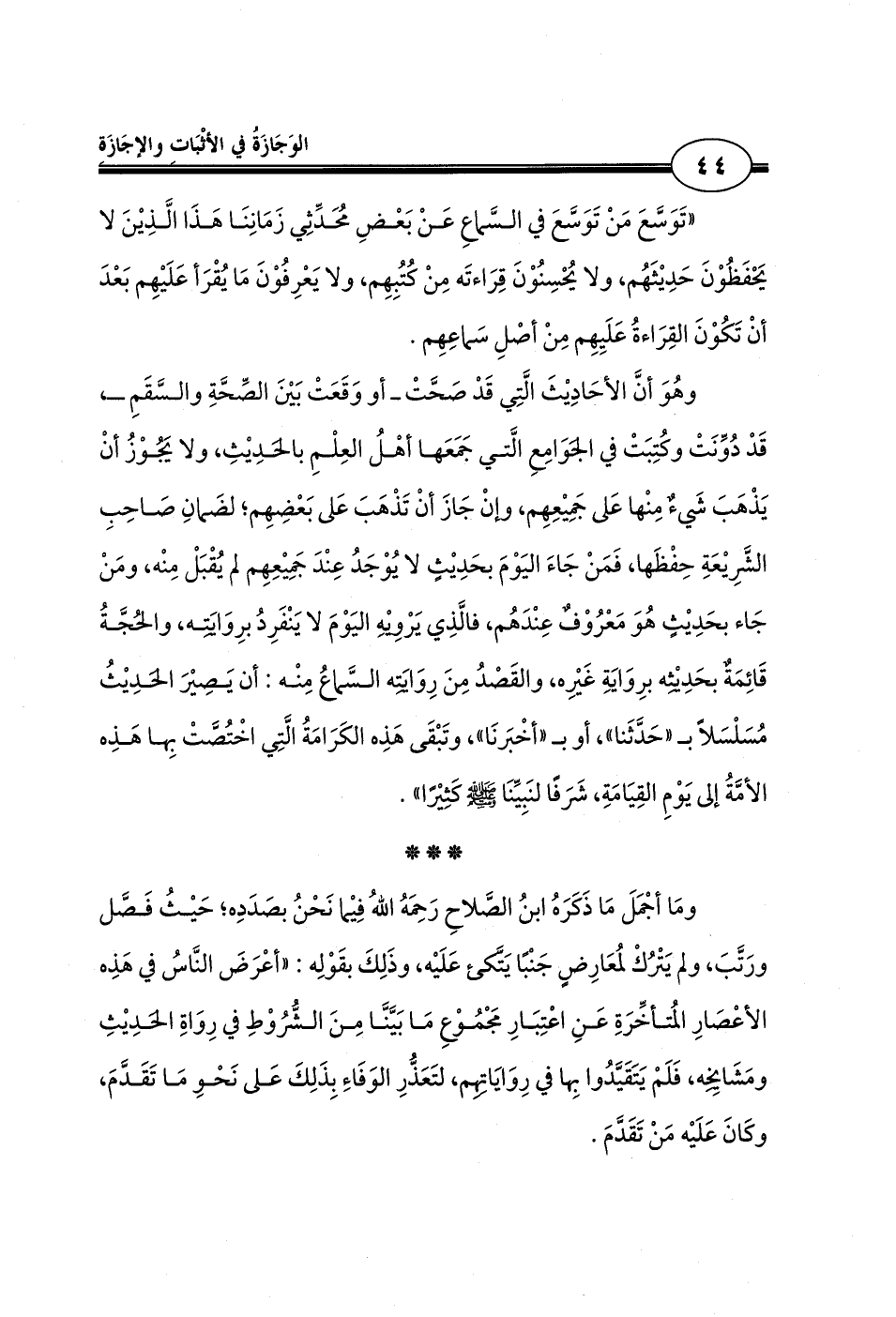 ومَا أجْمَلَ مَا ذَكَرَهُ ابنُ الصَّلاحِ رَحِمَهُ اللهُ فِيْما نَحْنُ بصَدَدِه؛ حَيْثُ فَصَّل ورَتَّبَ، ولم يَتْرُكْ لمُعَارِضٍ جَنْبًا يَتَّكئ عَلَيْه، وذَلِكَ بقَوْلِه: «أعْرَضَ النَّاسُ في هَذِه الأعْصَارِ المُتأخِّرَةِ عَنِ اعْتِبَارِ مَجْمُوْعِ مَا بَيَّنَّا مِنَ الشُّرُوْطِ في رِوَاةِ الحَدِيْثِ ومَشَايِخِه، فَلَمْ يَتَقَيَّدُوا بِها في رِوَايَاتِهِم، لتَعَذُّرِ الوَفَاءِ بِذَلِكَ عَلى نَحْوِ مَا تَقَدَّمَ، وكَانَ عَلَيْه مَنْ تَقَدَّمَ.