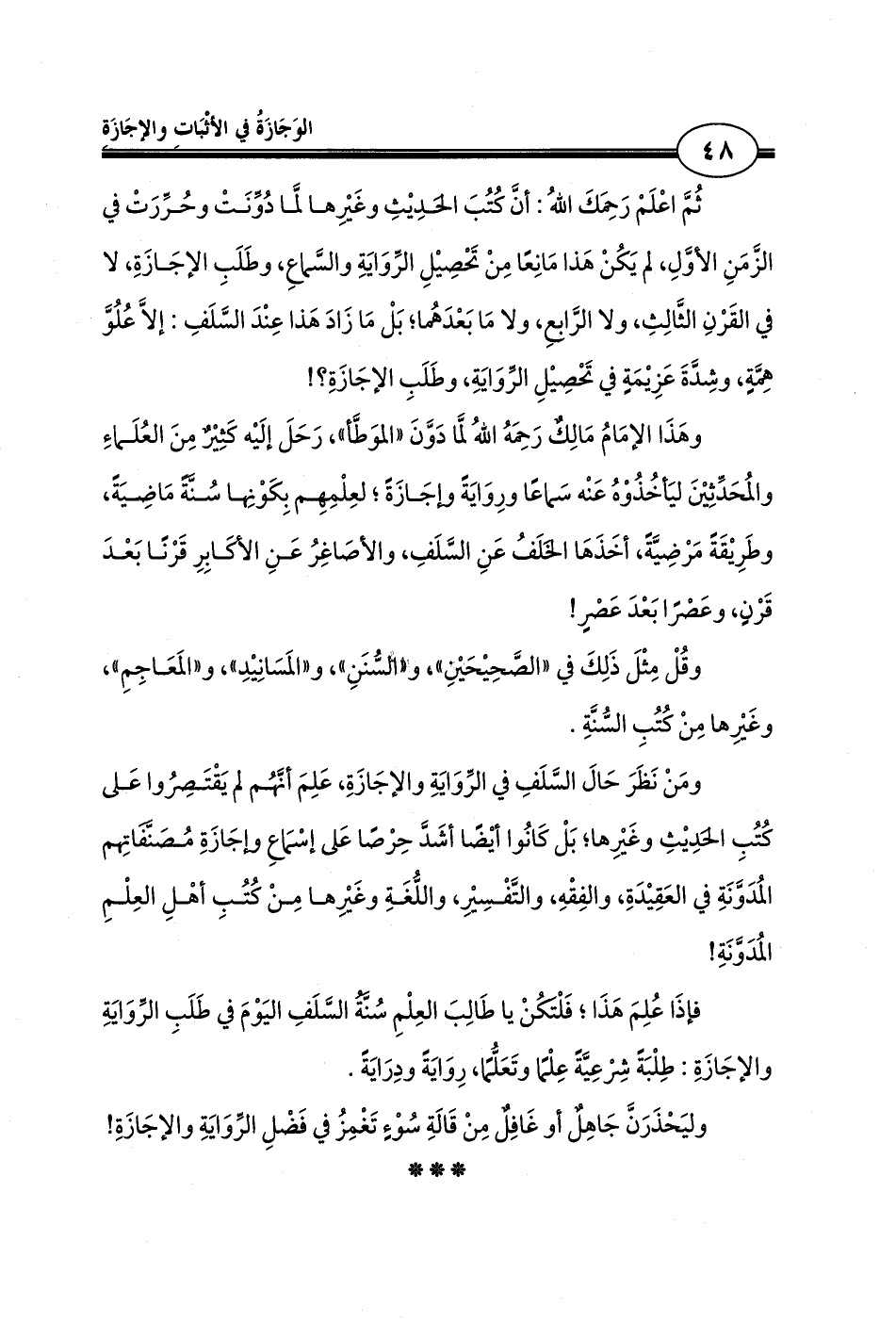 ومَنْ نَظَرَ حَالَ السَّلَفِ في الرِّوَايَةِ والإجَازَةِ، عَلِمَ أنَّهُم لم يَقْتَصِرُوا عَلى كُتُبِ الحَدِيْثِ وغَيْرِها؛ بَلْ كَانُوا أيْضًا أشَدَّ حِرْصًا عَلى إسْمَاعِ وإجَازَةِ مُصَنَّفَاتِهم المُدَوَّنَةِ في العَقِيْدَةِ، والفِقْهِ، والتَّفْسِيْرِ، واللُّغَةِ وغَيْرِها مِنْ كُتُبِ أهْلِ العِلْمِ المُدَوَّنَةِ!
