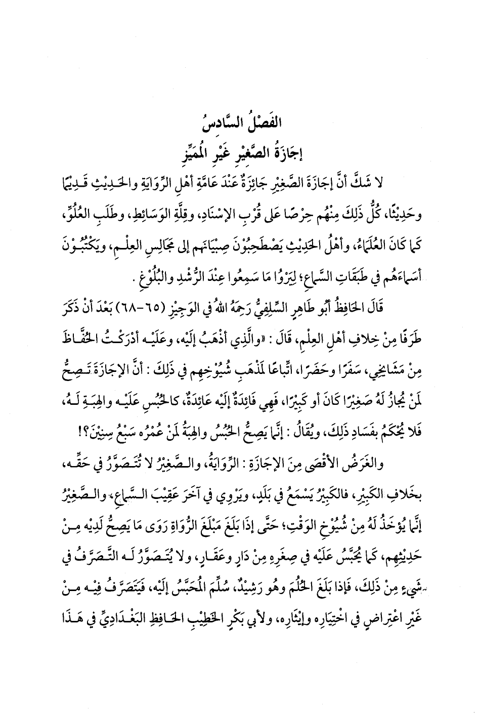 قَالَ الحَافِظُ أبُو طَاهِرٍ السِّلِفِيُّ رَحِمَهُ اللهُ في الوَجِيْزِ (65 - 68) بَعْدَ أنْ ذَكَرَ طَرَفًا مِنْ خِلافِ أهْلِ العِلْمِ، قَالَ: «والَّذِي أذْهَبُ إلَيْه، وعَلَيْه أدْرَكْتُ الحُفَّاظَ مِنْ مَشَايخِي، سَفَرًا وحَضَرًا، اتِّباعًا لمَذْهَبِ شُيُوْخِهِم في ذَلِكَ: أنَّ الإجَازَةَ تَصِحُّ لمَنْ يُجازُ لَهُ صَغِيْرًا كَانَ أو كَبِيْرًا، فَهِي فَائِدَةٌ إلَيْه عَائِدَةٌ، كالحُبُسِ عَلَيْه والهِبَةِ لَهُ، فَلا يُحْكَمُ بفَسَادِ ذَلِكَ، ويُقَالُ: إنَّما يَصِحُّ الحُبُسُ والهِبَةُ لمَنْ عُمْرُه سَبْعُ سِنِيْنَ؟!