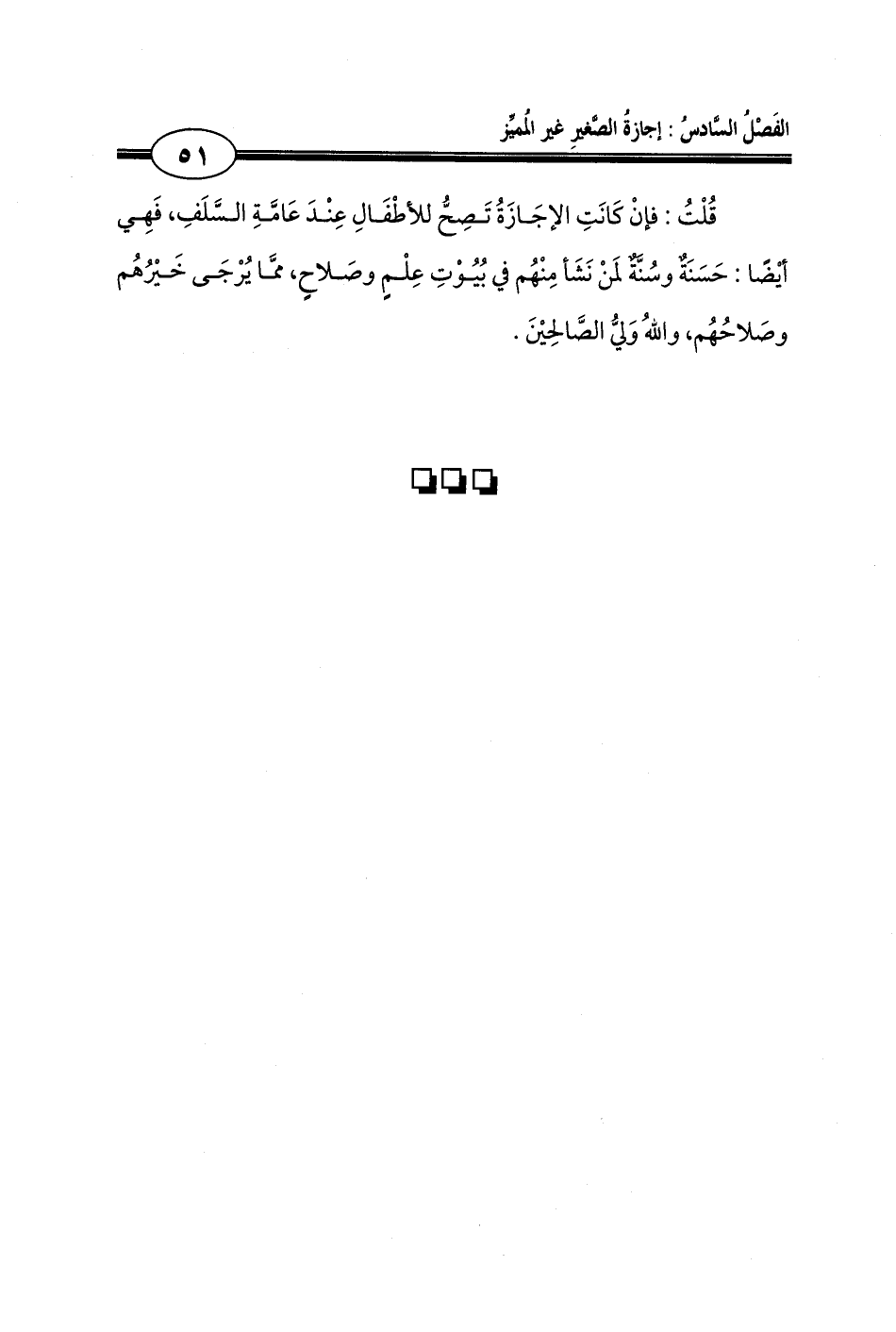 قُلْتُ: فإنْ كَانَتِ الإجَازَةُ تَصِحُّ للأطْفَالِ عِنْدَ عَامَّةِ السَّلَفِ، فَهِي أيْضًا: حَسَنَةٌ وسُنَّةٌ لمَنْ نَشَأ مِنْهُم في بُيُوْتِ عِلْمٍ وصَلاحٍ، ممَّا يُرْجَى خَيْرُهُم وصَلاحُهُم، واللهُ وَليُّ الصَّالحِيْنَ.