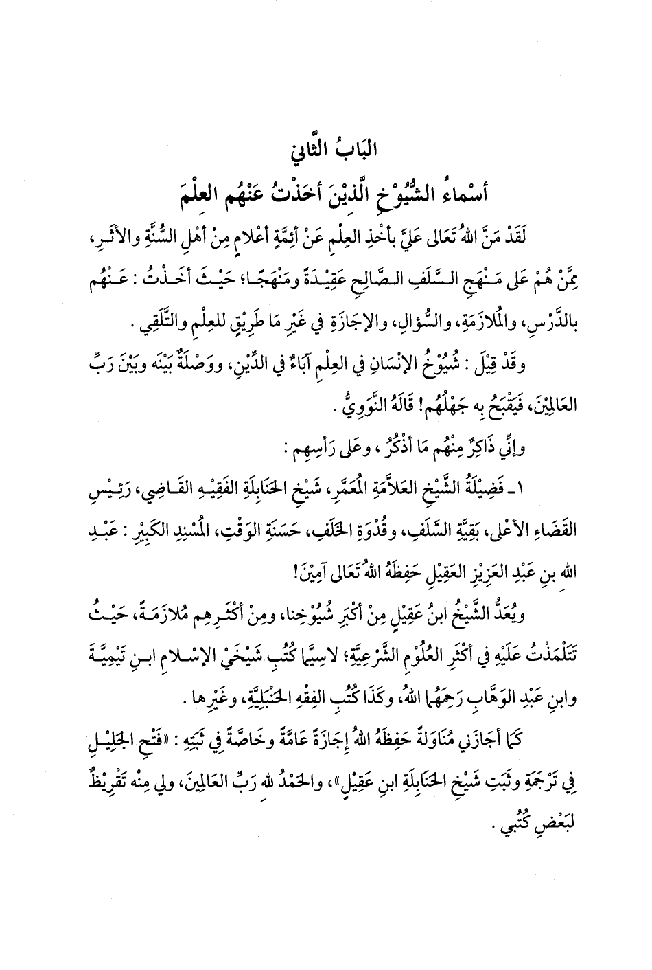 1 ـ فَضِيْلَةُ الشَّيْخِ العَلاَّمَةِ المُعَمَّرِ، شَيْخِ الحَنَابِلَةِ الفَقِيْهِ القَاضِي، رَئِيْسِ القَضَاءِ الأعْلى، بَقِيَّةِ السَّلَفِ، وقُدْوَةِ الخَلَفِ، حَسَنَةِ الوَقْتِ، المُسْنِدِ الكَبِيْرِ: عَبْدِ اللهِ بنِ عَبْدِ العَزِيْزِ العَقِيْلِ حَفِظَهُ اللهُ تَعَالى آمِيْنَ!