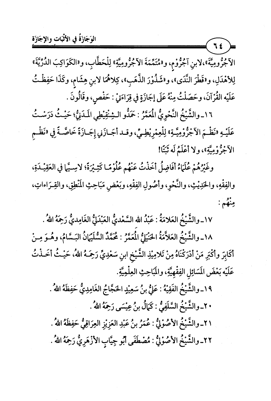 16 ـ والشَّيْخُ النَّحْوِيُّ المُعَمَّرُ: حَمَدُّو الشِنْقِيْطِي المَدَنِيُّ؛ حَيْثُ دَرَسْتُ عَلَيْهِ «نَظْمَ الآجْرُّوْمِيَّةِ» لِلْعِمْرِيْطِيِّ، وقد أجَازَني إِجَازَةً خَاصَّةً فِي «نَظْمِ الآجْرُّوْمِيَّةِ»، ولا أعْلَمُ لَه ثَبَتًا!