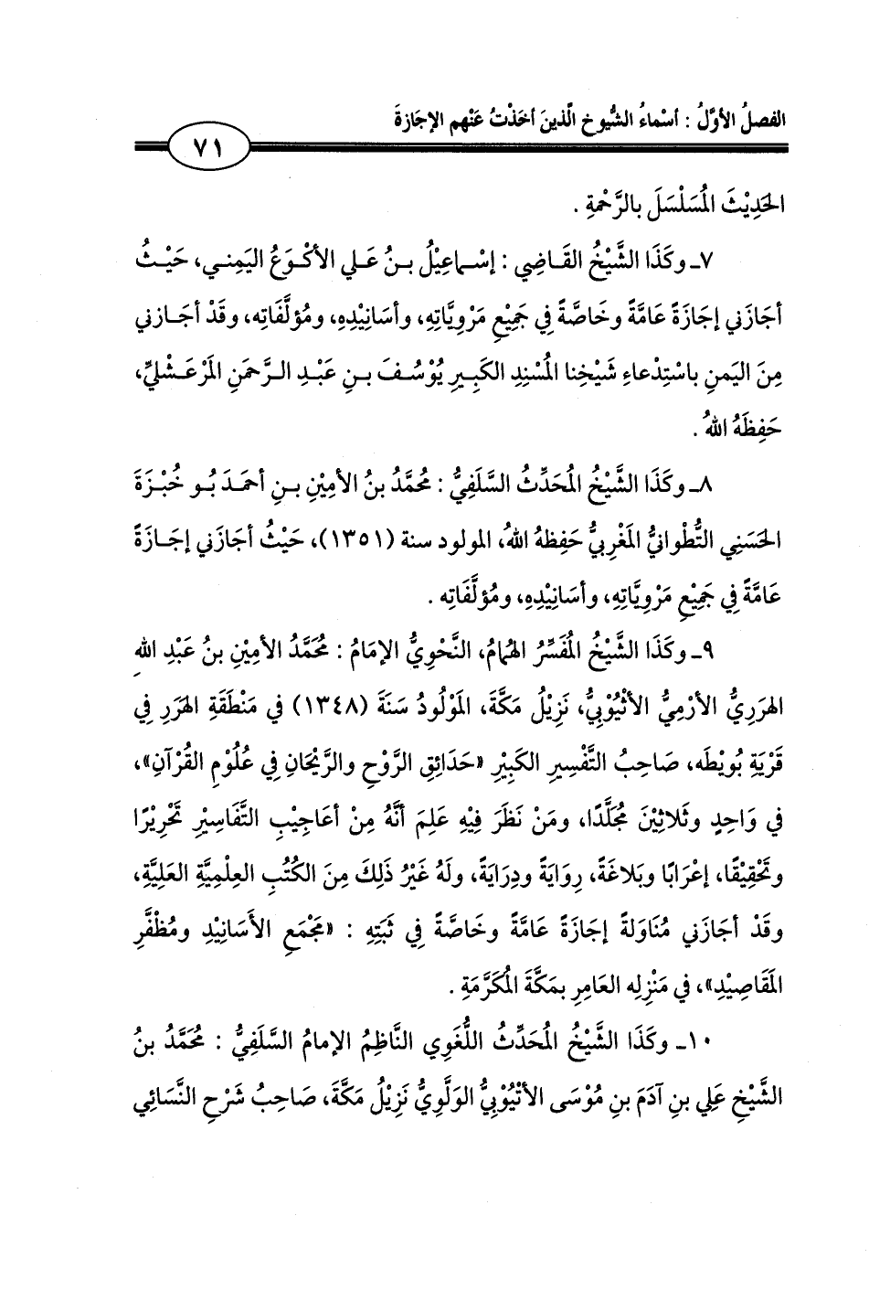 9 ـ وكَذَا الشَّيْخُ المُفَسِّرُ الهُمامُ، النَّحْوِيُّ الإمَامُ: مُحَمَّدُ الأمِيْنِ بنُ عَبْدِ اللهِ الهرَرِيُّ الأرْمِيُّ الأثْيُوْبِيُّ، نَزِيْلُ مَكَّةَ، المَوْلُودُ سَنَةَ (1348) في مَنْطَقَةِ الهَرَرِ فِي قَرْيَةِ بُويْطَه، صَاحِبُ التَّفْسِيرِ الكَبِيْرِ «حَدَائِقِ الرَّوْحِ والرَّيْحَانِ فِي عُلُوْمِ القُرْآنِ»، في وَاحِدٍ وثَلاثِيْنَ مُجَلَّدًا، ومَنْ نَظَرَ فِيْهِ عَلِمَ أنَّهُ مِنْ أعَاجِيْبِ التَّفَاسِيْرِ تَحْرِيْرًا وتَحْقِيْقًا، إعْرَابًا وبَلاغَةً، رِوَايَةً ودِرَايَةً، ولَهُ غَيْرُ ذَلِكَ مِنَ الكُتُبِ العِلْمِيَّةِ العَلِيَّةِ، وقَدْ أجَازَني مُنَاوَلةً إجَازَةً عَامَّةً وخَاصَّةً فِي ثَبَتِهِ: «مَجْمَعِ الأَسَانِيْدِ ومُظْفَّرِ المَقَاصِيْدِ»، في مَنْزِلِه العَامِرِ بمَكَّةَ المُكَرَّمَةِ.