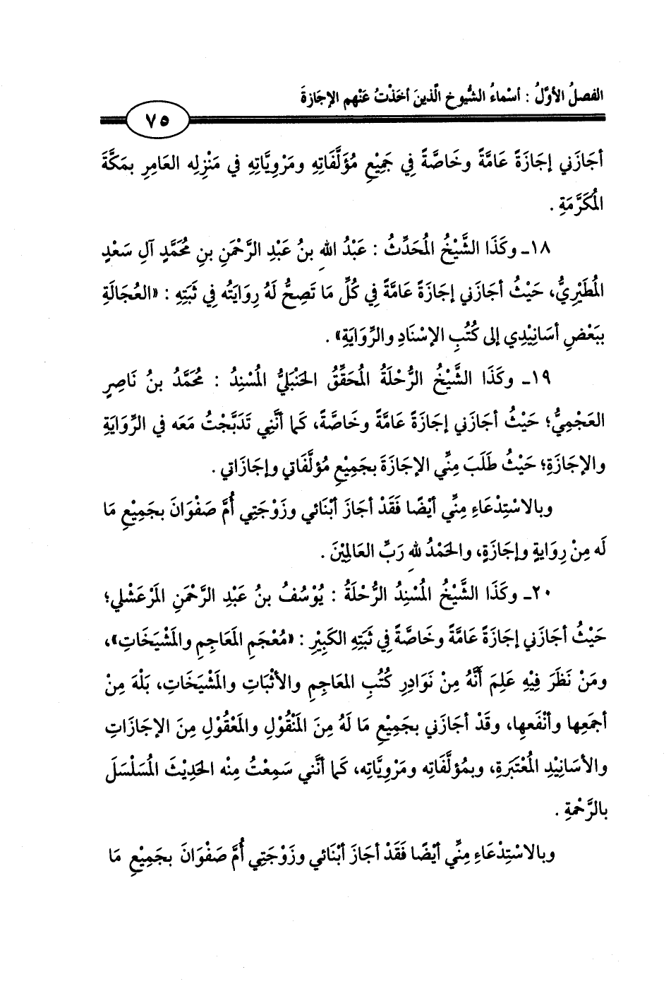 18 ـ وكَذَا الشَّيْخُ المُحَدِّثُ: عَبْدُ اللهِ بنُ عَبْدِ الرَّحْمَنِ بنِ مُحَمَّدٍ آلِ سَعْدٍ المُطَيْرِيُّ، حَيْثُ أجَازَني إجَازَةً عَامَّةً فِي كُلِّ مَا تَصِحُّ لَهُ رِوَايَتُه فِي ثَبَتِهِ: «العُجَالَةِ ببَعْضِ أسَانِيْدِي إلى كُتُبِ الإسْنَادِ والرِّوَايَةِ».