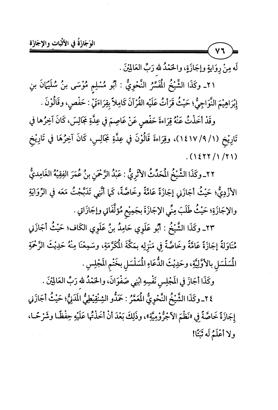 24 ـ وكَذَا الشَّيْخُ النَّحْوِيُّ المُعَمَّرُ: حَمَدُّو الشِنْقِيْطِيُّ المَدَنِيُّ؛ حَيْثُ أجَازَني إِجَازَةً خَاصَّةً فِي «نَظْمَ الآجْرُّوْمِيَّةِ»، وذَلِكَ بَعْدَ أنْ أخَذْتُها عَلَيْهِ حِفْظًا وشَرْحًا، ولا أعْلَمُ لَه ثَبَتًا!