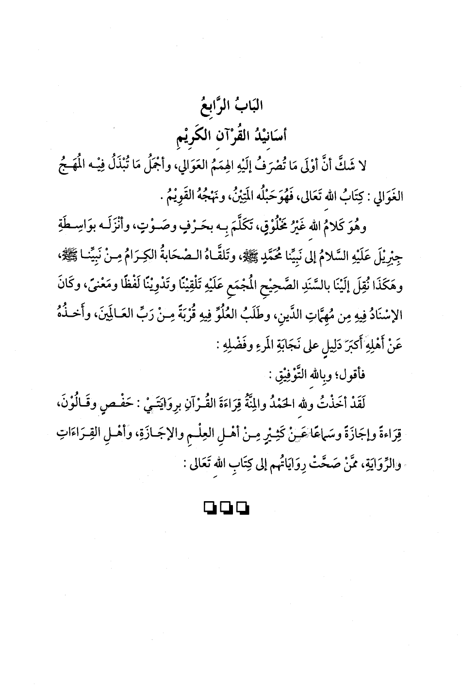 وهُوَ كَلامُ اللهِ غَيْرُ مَخْلُوْقٍ، تَكَلَّمَ بِه بحَرْفٍ وصَوْتٍ، وأنْزَلَه بوَاسِطَةِ جِبْرِيْلَ عَلَيْهِ السَّلامُ إلى نَبِيِّنا مُحَمَّدٍ - صلى الله عليه وسلم -، وتَلقَّاهُ الصْحَابةُ الكِرَامُ مِنْ نَبِيِّنا - صلى الله عليه وسلم -، وهَكَذَا نُقِلَ إلَيْنَا بالسَّنَدِ الصَّحِيْحِ المُجْمَعِ عَلَيْهِ تَلْقِيْنًا وتَدْوِيْنًا لَفْظًا ومَعْنىً، وكَانَ الإسْنَادُ فِيهِ مِن مُهِمَّاتِ الدَّينِ، وطَلَبُ العُلُوِّ فِيهِ قُرْبَةً مِنْ رَبِّ العَالَمِينَ، وأَخذُهُ عَنْ أَهْلِهِ أَكبَرَ دَلِيلٍ على نَجَابَةِ المَرءِ وفَضْلِهِ: