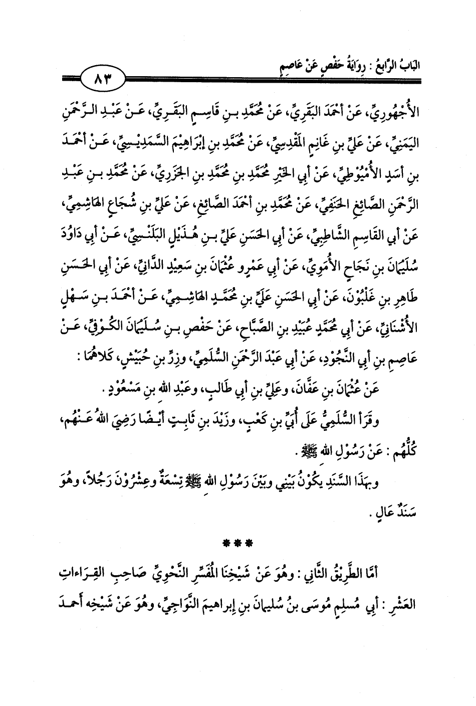 الأُجْهُورِيِّ، عَنْ أحْمَدَ البَقَرِيِّ، عَنْ مُحَمَّدِ بنِ قَاسِمٍ البَقَرِيِّ، عَنْ عَبْدِ الرَّحْمَنِ اليَمَنِيِّ، عَنْ عَليِّ بنِ غَانِمٍ المَقْدِسِيِّ، عَنْ مُحَمَّدِ بنِ إبْرَاهِيْمَ السَّمَدِيْسِيِّ، عَنْ أحْمَدَ بنِ أسَدٍ الأُمْيُوْطِيِّ، عَنْ أبِي الخَيْرِ مُحَمَّدِ بنِ مُحَمَّدِ بنِ الجَزَرِيِّ، عَنْ مُحَمَّدِ بنِ عَبْدِ الرَّحْمَنِ الصَّائِغِ الحَنَفِيِّ، عَنْ مُحَمَّدِ بنِ أحْمَدَ الصَّائِغِ، عَنْ عَليِّ بنِ شُجَاعٍ الهَاشِمِيِّ، عَنْ أبي القَاسِمِ الشَّاطِبِيِّ، عَنْ أبِي الحَسَنِ عَليِّ بنِ هُذَيْلٍ البَلَنْسِيِّ، عَنْ أبِي دَاوُدَ سُلَيْمَانَ بنِ نَجَاحٍ الأُمَوِيِّ، عَنْ أبِي عَمْرٍو عُثْمَانَ بنِ سَعِيْدٍ الدَّانِيِّ، عَنْ أبِي الحَسَنِ طَاهِرِ بنِ غَلْبُوْنَ، عَنْ أبِي الحَسَنِ عَلَيِّ بنِ مُحَمَّدٍ الهَاشِمِيِّ، عَنْ أحْمَدَ بنِ سَهْلٍ الأُشْنَانِيِّ، عَنْ أبِي مُحَمَّدٍ عُبَيْدِ بنِ الصَّبَّاحِ، عَنْ حَفْصِ بنِ سُلَيْمَانَ الكُوْفِيِّ، عَنْ عَاصِمِ بنِ أبِي النَّجُوْدِ، عَنْ أبِي عَبْدَ الرَّحْمَنِ السُّلَمِيِّ، وزِرِّ بنِ حُبَيْشٍ، كَلاهُمَا: