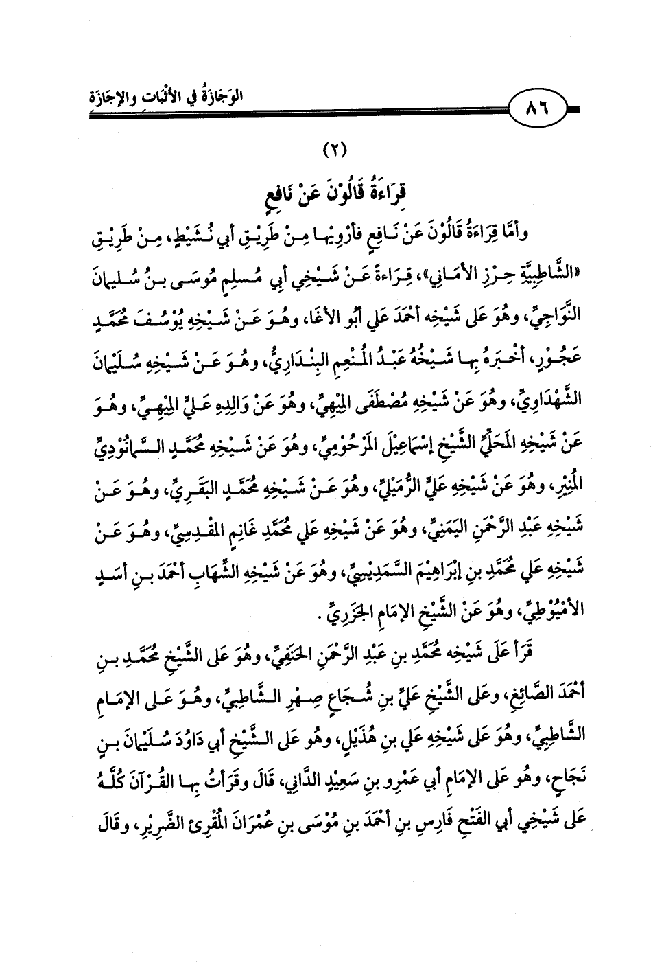 وأمَّا قِرَاءَةُ قَالُوْنَ عَنْ نَافِعٍ فأرْوِيْها مِنْ طَرِيْقِ أبي نُشَيْطٍ، مِنْ طَرِيْقِ «الشَّاطِبِيَّةِ حِرْزِ الأمَانِي»، قِرَاءةً عَنْ شَيْخِي أبِي مُسلِمٍ مُوسَى بنُ سُليمانَ النَّوَاجِيِّ، وهُوَ عَلى شَيْخِه أحْمَدَ عَلي أبُو الأغَا، وهُوَ عَنْ شَيْخِهِ يُوْسُفَ مُحَمَّدٍ عَجُوْرٍ، أخْبَرهُ بِها شَيْخُهُ عَبْدُ المُنْعِمِ البِنْدَارِيُّ، وهُوَ عَنْ شَيْخِهِ سُلَيْمانَ الشَّهْدَاوِيِّ، وهُوَ عَنْ شَيْخِهِ مُصْطَفَى المِيْهِيِّ، وهُوَ عَنْ وَالِدِهِ عَليٍّ المِيْهِيِّ، وهُوَ عَنْ شَيْخِهِ المَحَلِّيِّ الشَّيْخِ إسْمَاعِيْلَ المَرْحُوْمِيِّ، وهُوَ عَنْ شَيْخِهِ مُحَمَّدٍ السَّمانُوْدِيِّ المُنِيْرِ، وهُوَ عَنْ شَيْخِهِ عَليٍّ الرُّمَيْليِّ، وهُوَ عَنْ شَيْخِهِ مُحَمَّدٍ البَقَرِيِّ، وهُوَ عَنْ شَيْخِهِ عَبْدِ الرَّحْمَنِ اليَمَنِيِّ، وهُوَ عَنْ شَيْخِهِ عَلي مُحَمَّدِ غَانِمٍ المقْدِسِيِّ، وهُوَ عَنْ شَيْخِهِ عَلي مُحَمَّدِ بنِ إبْرَاهِيْمَ السَّمَدِيْسِيِّ، وهُوَ عَنْ شَيْخِهِ الشِّهَابِ أحْمَدَ بنِ أسَدٍ الأمْيُوْطِيِّ، وهُوَ عَنْ الشَّيْخِ الإمَامِ الجَزَرِيِّ.