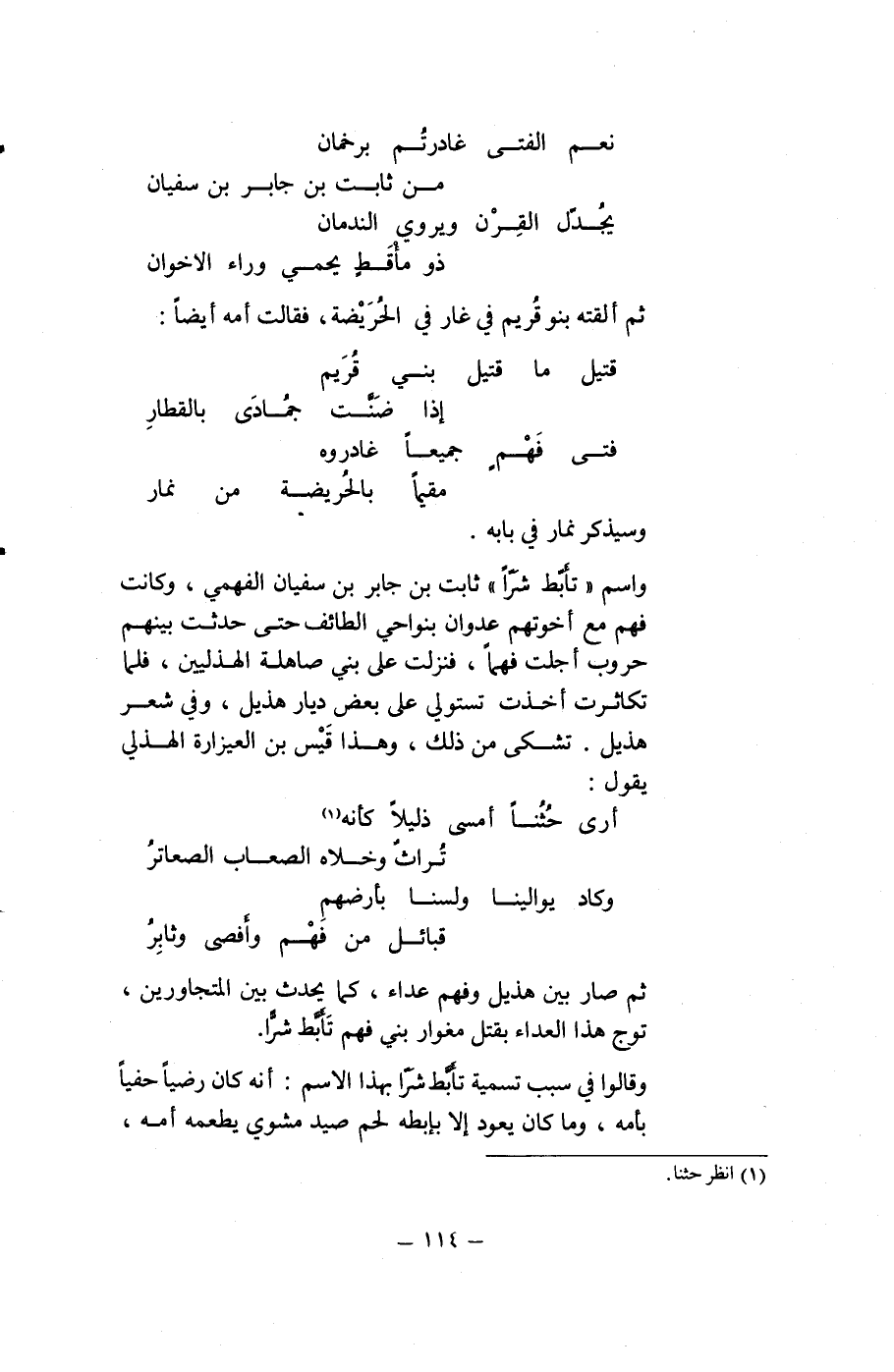 واسم "تأبَّط شرّاً" ثابت بن جابر بن سفيان الفهمي، وكانت فهم مع أخوتهم عدوان بنواحي الطائف حتى حدثت بينهم حروب أجلت فهماً، فنزلت على بني صاهلة الهذليين، فلما تكاثرت أخذت تستولي على بعض ديار هذيل، وفي شعر هذيل. تشكى من ذلك، وهذا قَيْس بن العيزارة الهذلي يقول: