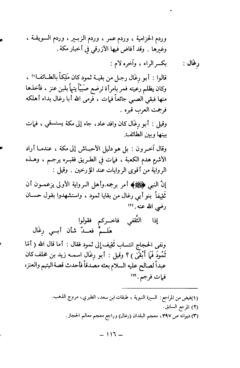 ونفىِ الحجاج انتساب ثَقِيف إلى ثمود فقال: أما قال الله (أمّا ثَمُودَ فَمَا أَبقَى)؟ وقيل: أبو رِغَال اسمه زيد بن مخلف كان عبداً لصالح عليه السلام بعثه مصدقاً فأحدث قصة اليتيم والعنز، فمات فرجم. (¬3)