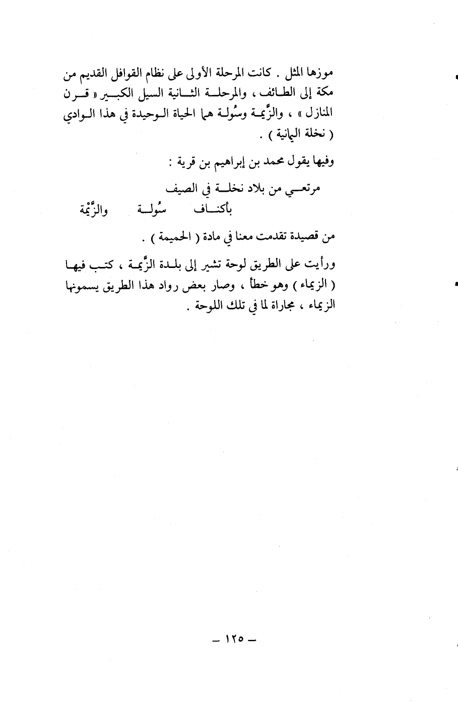 موزها المثل. كانت المرحلة الأولى على نظام القوافل القديم من مكة إلى الطائف، والمرحلة الثانية السيل الكبير "قرن المنازل"، والزَّيمة وسُولة هما الحياة الوحيدة في هذا الوادي (نخلة يمانية).