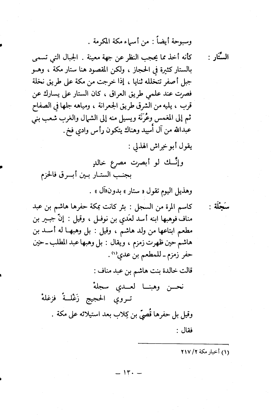 سَجْلَة: كاسم المرة من السجل: بئر كانت بمكة حفرها هاشم بن عبد مناف فوهبها ابنه أسد لعَدي بن نوفل، وقيل: إن جبير بن مطعم ابتاعها من ولد هاشم، وقيل: بل وهبها له أسد بن هاشم حين ظهرت زمزم، ويقال: بل وهبها عبد المطلب -حين حفر زمزم- للمطعم بن عدي (¬1).