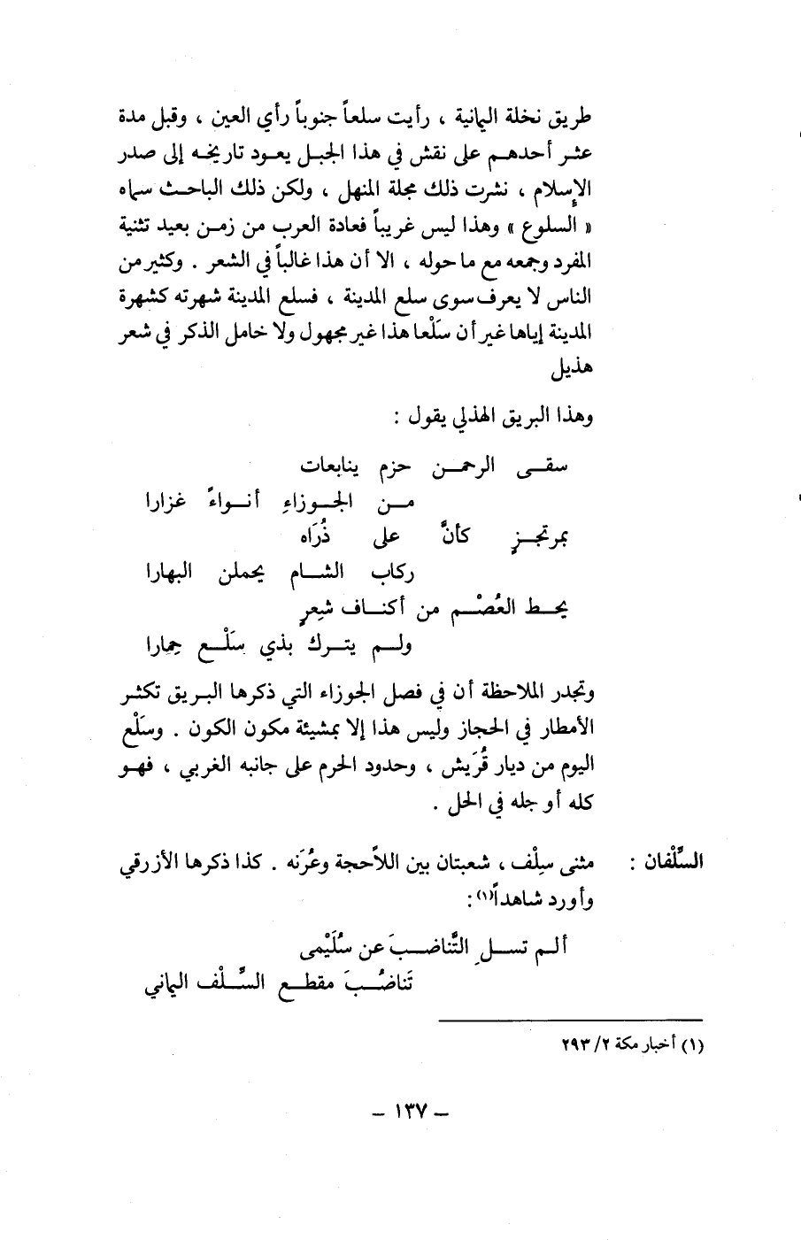 وتجدر الملاحظة أن في فصل الجوزاء التي ذكرها البريق تكثر الأمطار في الحجاز وليس هذا إلا بمشيئة مكون الكون. وسَلعْ اليوم من ديار قرَيش، وحدود الحرم على جانبه الغربي، فهو كله أو جله في الحل.
