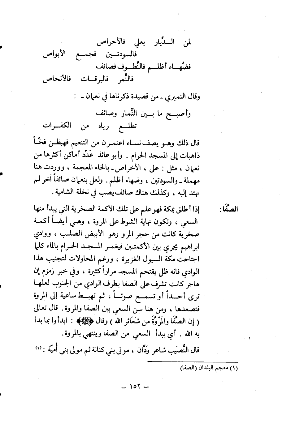 الصَّفَا: إذا أطلق بمكة فهو علم على تلك الأكمة الصخرية التي يبدأ منها السعي، وتكون نهاية الشوط على المروة، وهي أيضاً أكمة صخرية كانت من حجر المرو وهو الأبيض الصلب، ووادي ابراهيم يجري بين الأكمتين فيغمر المسجد الحرام بالماء كلما اجتاحت مكة السيول الغزيرة، ورغم المحاولات لتجنيب هذا الوادي فإنه ظل يقتحم المسجد مراراً كثيرة، وفي خبر زمزم إن هاجر كانت تشرف على الصفا بطرف الوادي من الجنوب لعلها ترى أحداً أو تسمع صوتاً، ثم تهبط ساعية إلى المروة فتصعدها، ومن هنا سن السعي بين الصفا والمروة. قال تعالى {إنَّ الصَّفَا والمَرْوُةَ من شَعَائر الله} وقال - صلى الله عليه وسلم -: ابدأوا بما بدأ به الله. أي يبدأ السعي من الصفا وينتهي بالمروة.
