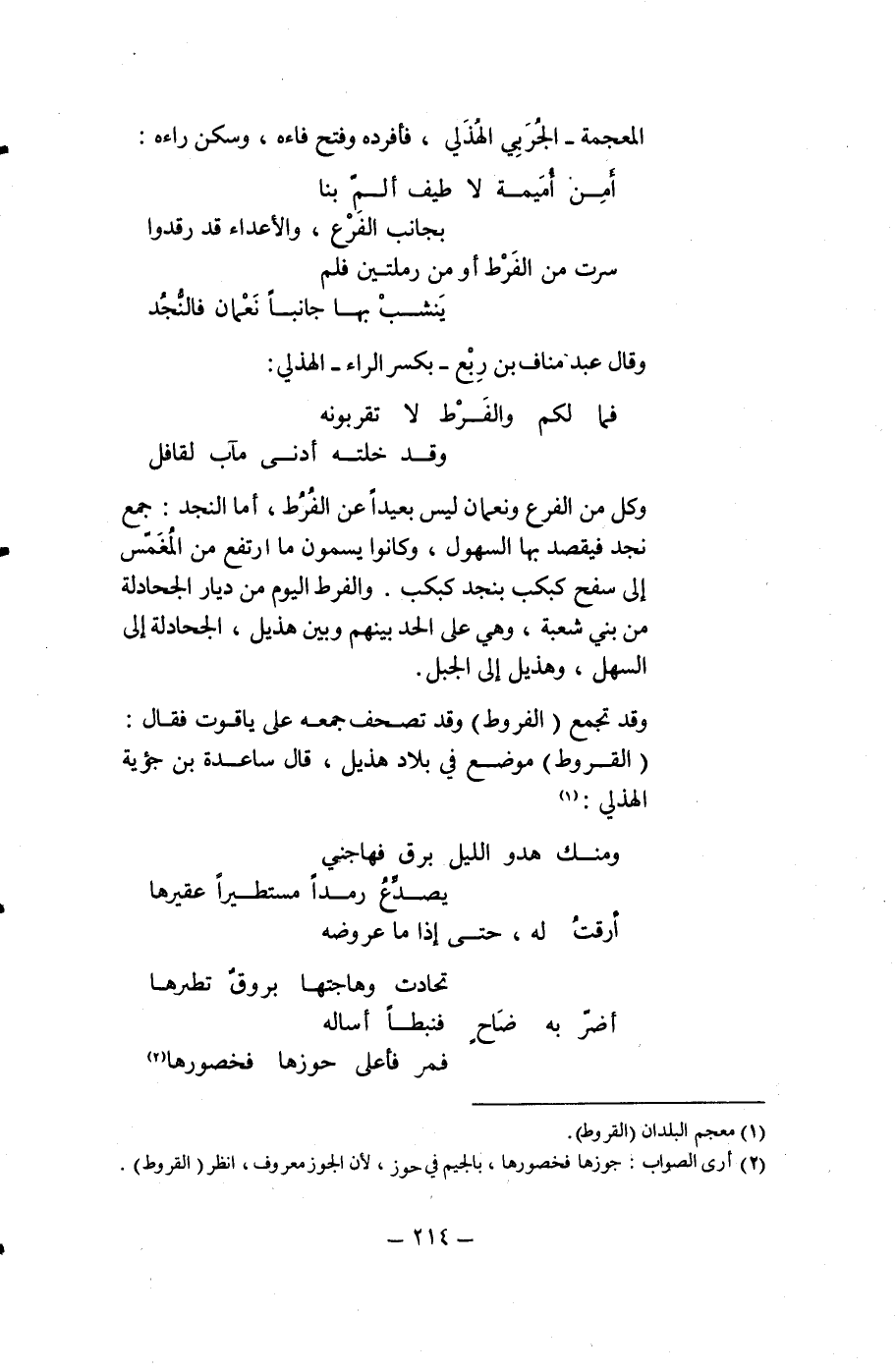 وقد تجمع (الفروط) وقد تصحف جمعه على ياقوت فقال: (القروط) موضع في بلاد هذيل، قال ساعدة بن جؤية الهذلي: (¬1)