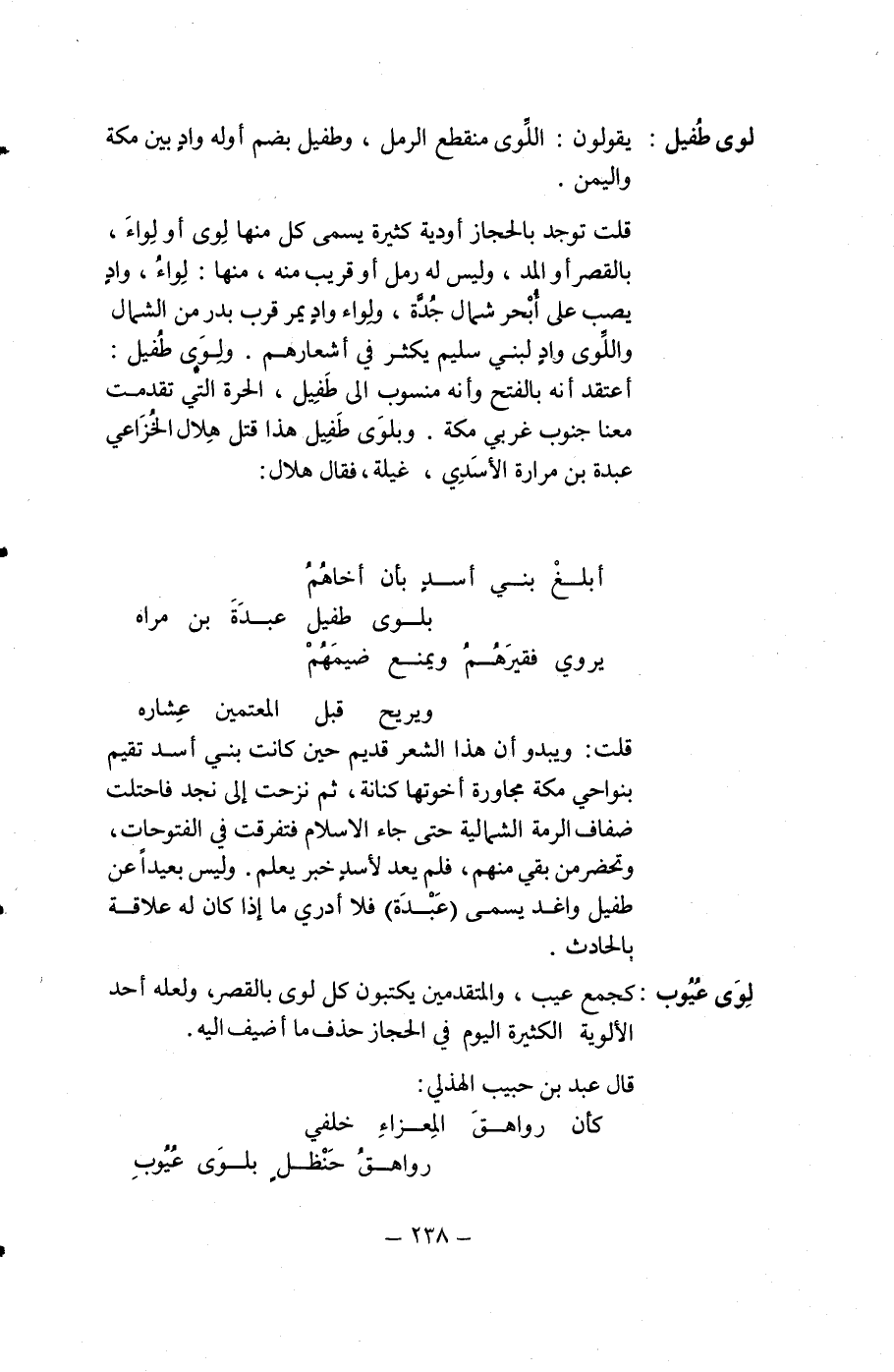 قلت توجد بالحجاز أودية كثيرة يسمى كل منها لِوى أو لِواءَ، بالقصر أو المد، وليس له رمل أو قريب منه، منها: لِواءُ، وادٍ يصب على أُبْحر شمال جُدَّة، ولواء وادٍ يمر قرب بدر من الشمال واللِّوى وادٍ لبني سليم يكثر في أشعارهم. ولِوَى طُفيل: أعتقد أنه بالفتح وأنه منسوب إلى طَفِيل، الحرة التي تقدمت معنا جنوب غربي مكة. وبلوَى طَفِيل هذا قتل هِلال الخُزَاعي عبدة بن مرارة الأسَدِي، غيلة، فقال هلال: