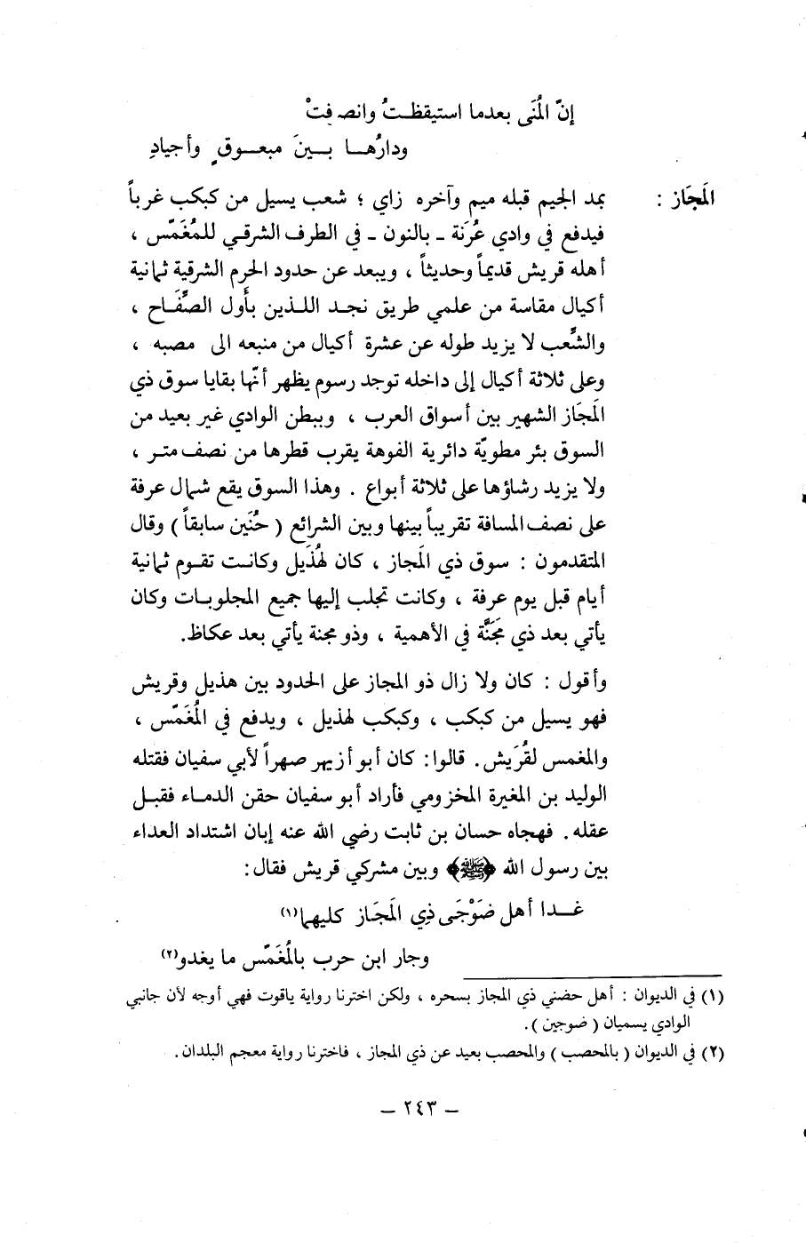 (¬1) في الديوان: أهل حضني ذي المجاز بسحره، ولكن اخترنا رواية ياقوت فهي أوجه لأن جانبي الوادي يسميان (ضوجين).