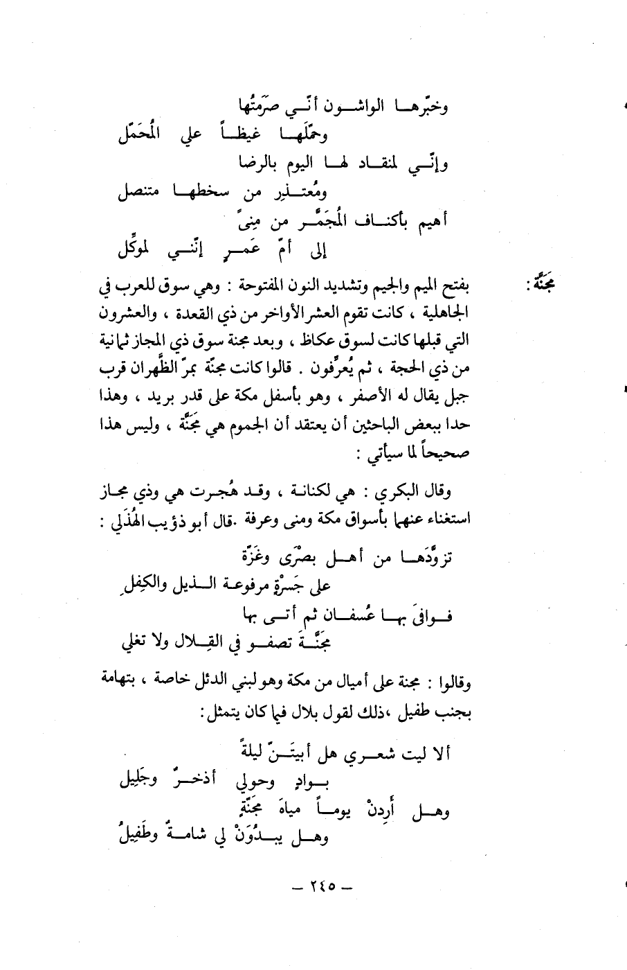 وقال البكري: هي لكنانة، وقد هُجرت هي وذي مجاز استغناء عنهما بأسواق مكة ومنى وعرفة. قال أبو ذؤيب الهُذَلي: