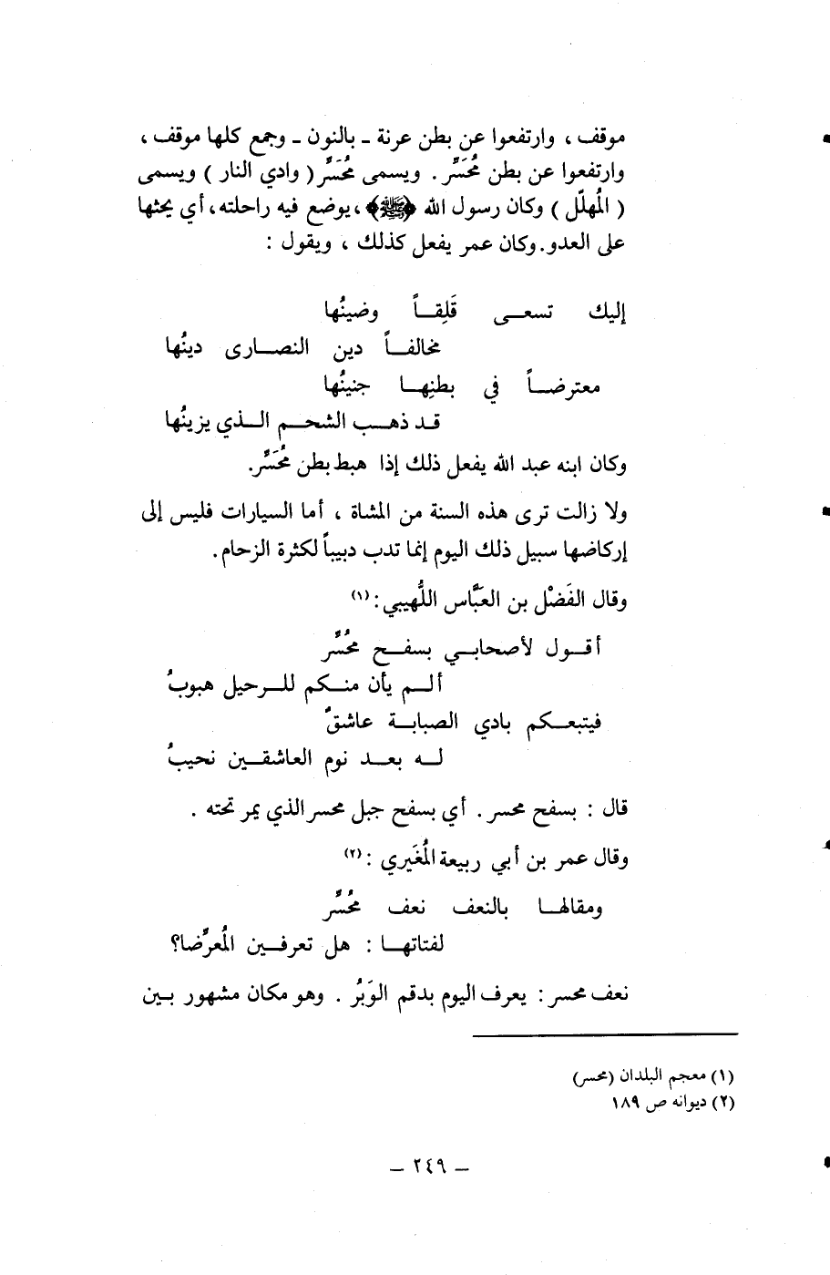 موقف، وارتفعوا عن بطن عرنة -بالنون- وجمع كلها موقف، وارتفعوا عن بطن مُحسِّر. ويسمى محُسِّر (وادي النار) ويسمى (المُهلّل) وكان رسول الله - صلى الله عليه وسلم -، يوضع فيه راحلته، أي يحثها على العدو. وكان عمر يفعل كذلك، ويقول: