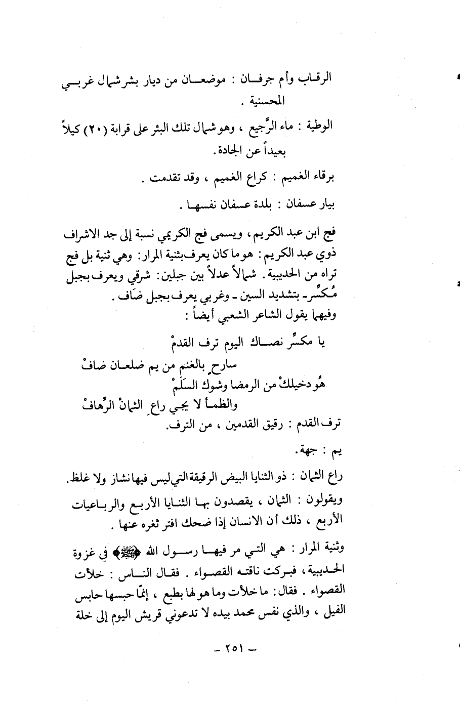 فج ابن عبد الكريم، وشممى فج الكريمي نسبة إلى جد الأشراف ذوي عبد الكريم: هو ما كان يعرف بثنية المرار: وهي ثنية بل فج تراه من الحديبية. شمالاً عدلاً بين جبلين: شرقي ويعرف بجبل مُكسِّر -بتشديد السين- وغربي يعرف بجبل ضَاف.