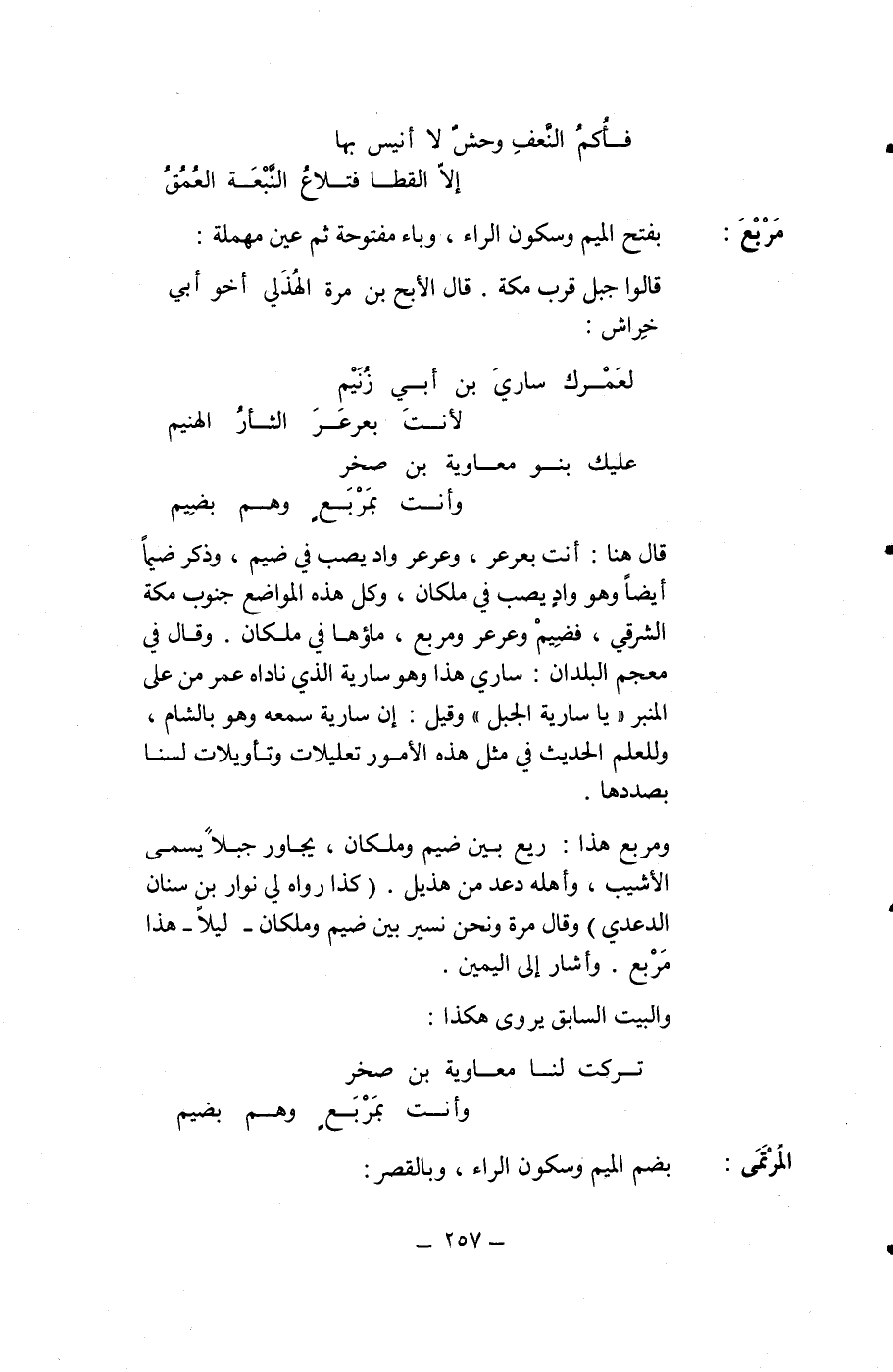 قال هنا: أنت بعرعر، وعرعر واد يصب في ضيم، وذكر ضيماً أيضاً وهو وادٍ يصب في ملكان، وكل هذه المواضع جنوب مكة الشرقي، فضِيمْ وعرعر ومربع، ماؤها في ملكان. وقال في معجم البلدان: ساري هذا وهو سارية الذي ناداه عمر من على المنبر "يا سارية الجبل" وقيل: إن سارية سمعه وهو بالشام، وللعلم الحديث في مثل هذه الأمور تعليلات وتأويلات لسنا بصددها.