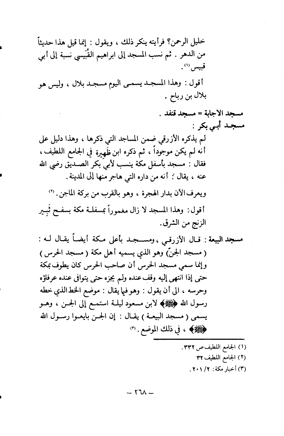 خليل الرحمن؟ فرأيته ينكر ذلك، ويقول: إنما قيل هذا حديثاً من الدهر. ثم نسب المسجد إلى إبراهيم القُبَيسي نسبة إلى أبي قبيس (¬1).