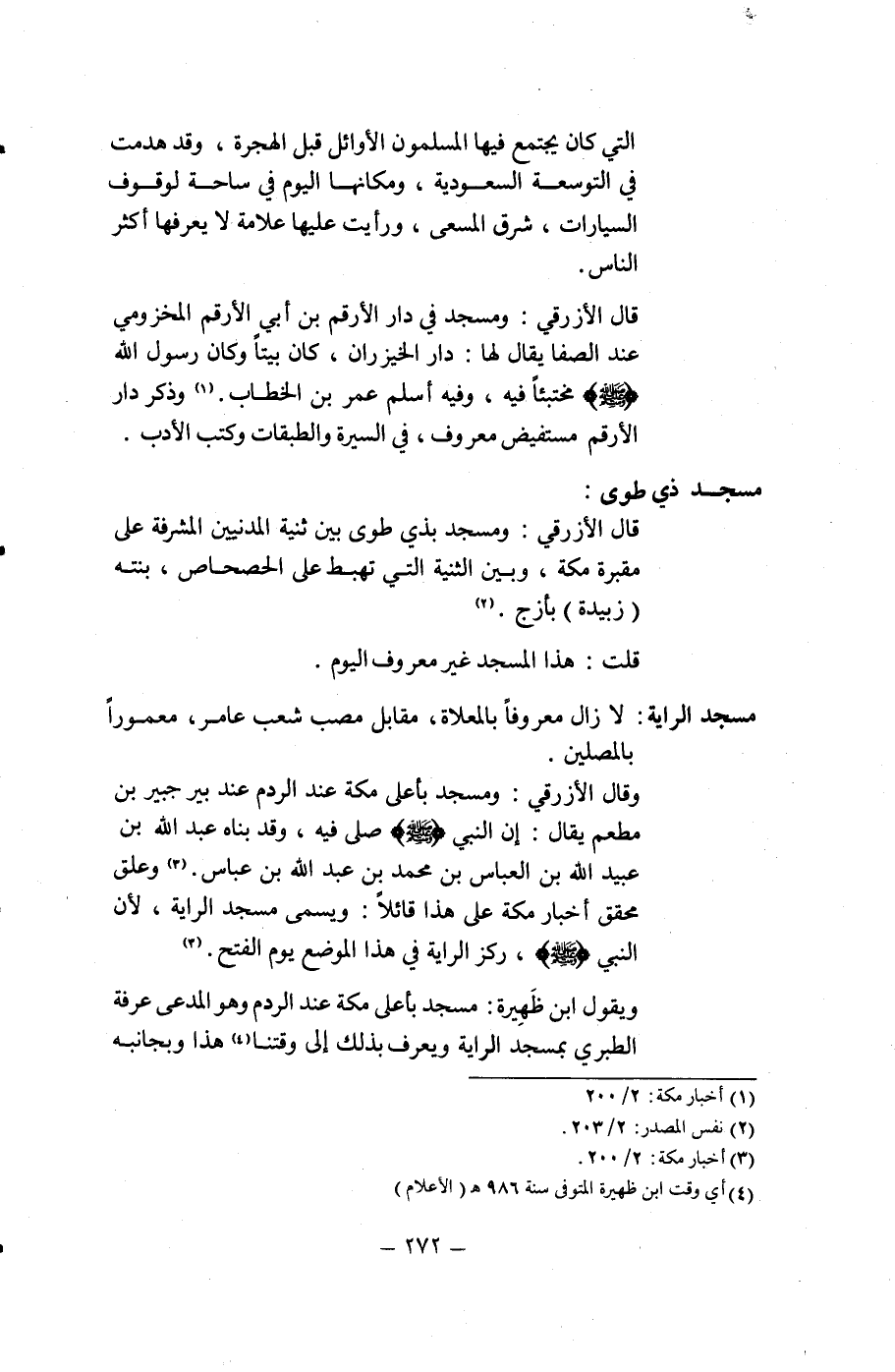 قال الأزرقي: ومسجد في دار الأرقم بن أبي الأرقم المخزومي عند الصفا يقال لها: دار الخيزران، كان بيتاً وكان رسول الله - صلى الله عليه وسلم - مختبئاً فيه، وفيه أسلم عمر بن الخطاب. (¬1) وذكر دار الأرقم مستفيض معروف، في السيرة والطبقات وكتب الأدب.