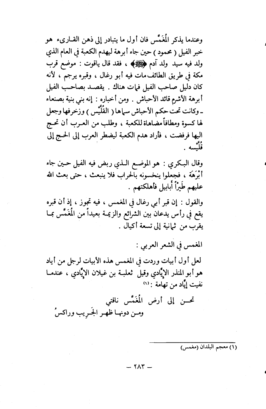 وعندما يذكر المُغَمَّس فإن أول ما يتبادر إلى ذهن القارىء هو خبر الفيل (محمود) حين جاء أبرهة ليهدم الكعبة في العام الذي ولد فيه سيد ولد آدم - صلى الله عليه وسلم -، فقد قال ياقوت: موضع قرب مكة في طريق الطائف مات فيه أبو رغال، وقبره يرجم، لأنه كان دليل صاحب الفيل فمات هناك. يقصد بصاحب الفيل أبرهة الأشرم قائد الأحباش. ومن أخباره: إنه بني بنية بصنعاء - وكانت تحت حكم الأحباش سماها (القُلَّيْس) وزخرفها وجعل لها كسوة ومطافاً مضاهاة للكعبة، وطلب من العرب أن تحج إليها فرفضت، فأراد هدم الكعبة ليضطر العرب إلى الحج إلى قُلَّيْسه.