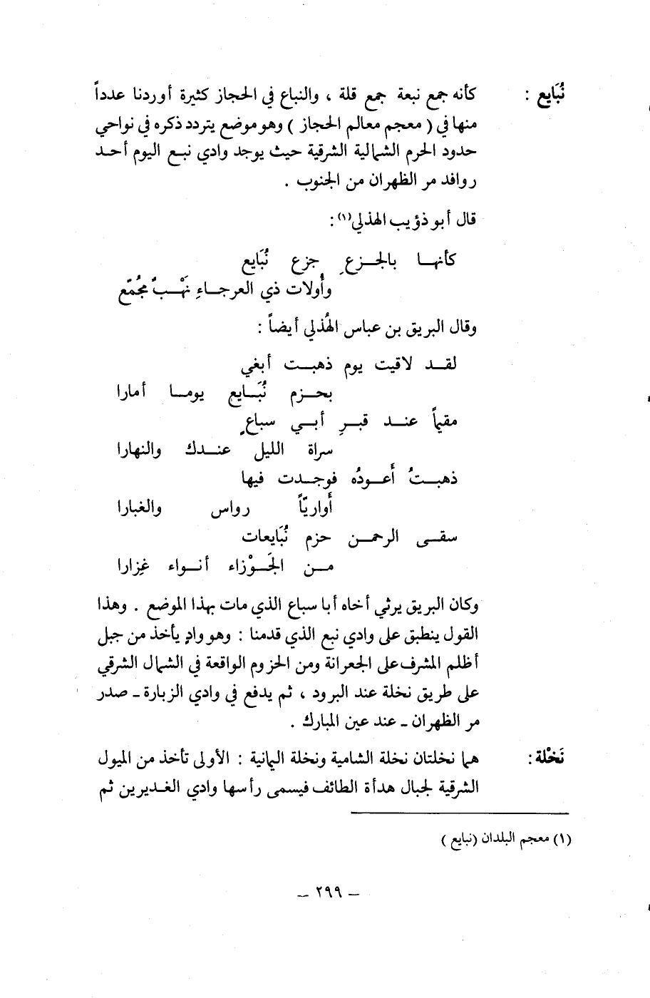 وكان البريق يرثي أخاه أبا سباع الذي مات بهذا الموضع. وهذا القول ينطبق على وادي نبع الذي قدمنا: وهو وادٍ يأخذ من جبل أظلم المشرف على الجعرانة ومن الحزوم الواقعة في الشمال الشرقي على طريق نخلة عند البرود، ثم يدفع في وادي الزبارة -صدر مر الظهران- عند عين المبارك.