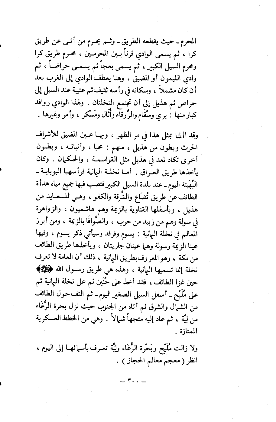 وقد ألمنا بمثل هذا في مر الظهر، وبها عين المضيق للأشراف الحرث وبطون من هذيل، منهم: محيا، وأنباته، وبطون أخرى تكاد تعد في هذيل مثل القواسمة، والحكمان. وكان يأخذها طريق العراق. أما نخلة اليمانية فرأسها البوبابة - البُهَيتة اليوم- عند بلدة السيل الكبير فتصب فيها جميع مياه هدأة الطائف عن طريق تُضَاع والشَّرقة والكفو، وهي للسعايد من هذيل، وبأسفلها القناوية بالزيمة وهم هاشميون، والزواهرة في سولة وهم من زبيد من حرب، والصَّوافَا بالزيمة، ومن أبرز المعالم في نخلة اليمانية: يسوم وفرقد وسيأتي ذكر يسوم، وفيها عينا الزيمة وسولة وهما عينان جاريتان، ويأخذها طريق الطائف من مكة، وهو المعروف بطريق اليمانية، ذلك أن العامة لا تعرف نخلة إنما تسميها اليمانية، وهذه هي طريق رسول الله - صلى الله عليه وسلم - حين غزا الطائف، فقد أخذ على حُنَين ثم على نخلة اليمانية ثم على مُلَيْح -أسفل السيل الصغير اليوم- ثم التف حول الطائف من الشمال والشرق ثم أتاه من الجنوب حيث نزل بحرة الرُّغَاء من لِيّة، ثم عاد إليه متجهاً شمالاً. وهي من الخطط العسكرية الممتازة.
