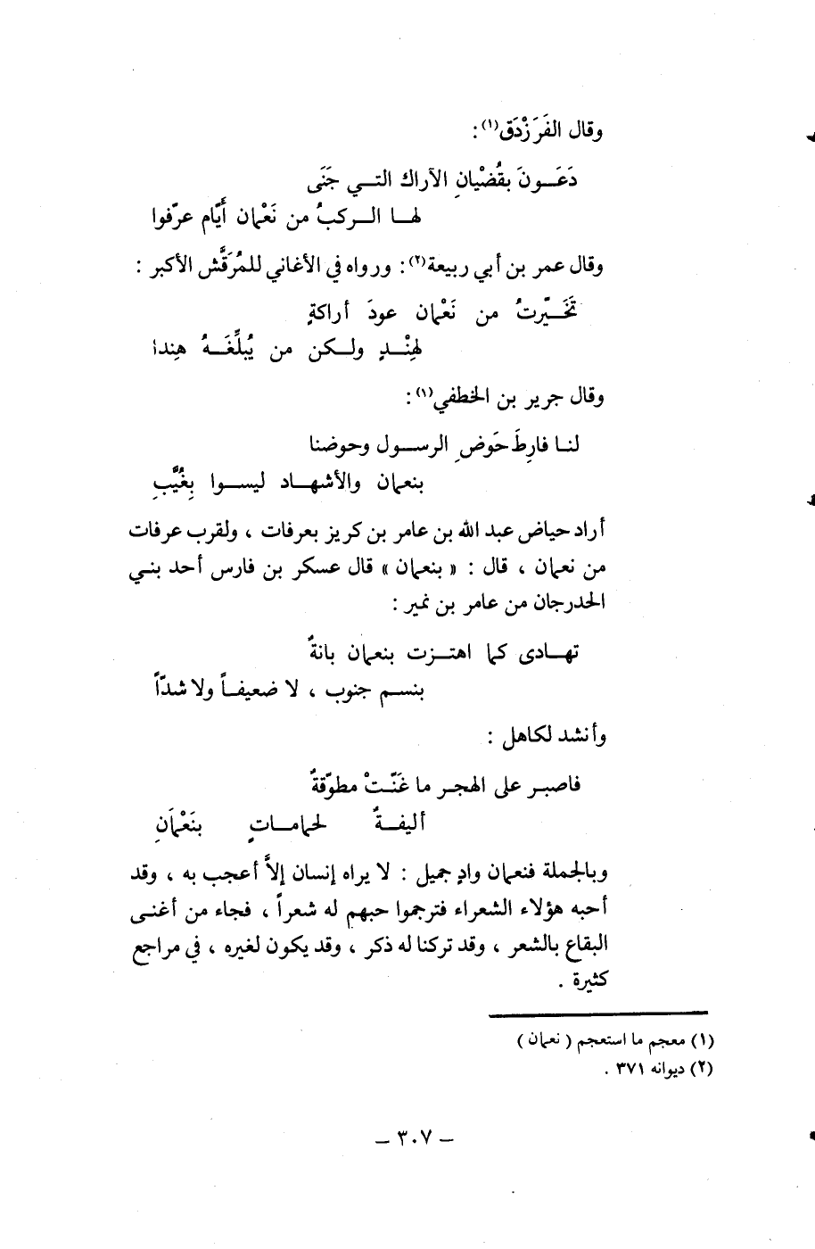 وبالجملة فنعمان وادٍ جميل: لا يراه إنسان إلاَّ أعجب به، وقد أحبه هؤلاء الشعراء فترجموا حبهبم له شعراً، فجاء من أغنى البقاع بالشعر، وقد تركنا له ذكر، وقد يكون لغيره، في مراجع كثيرة.